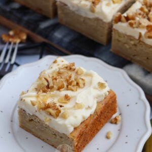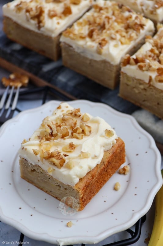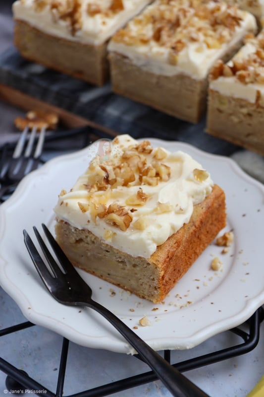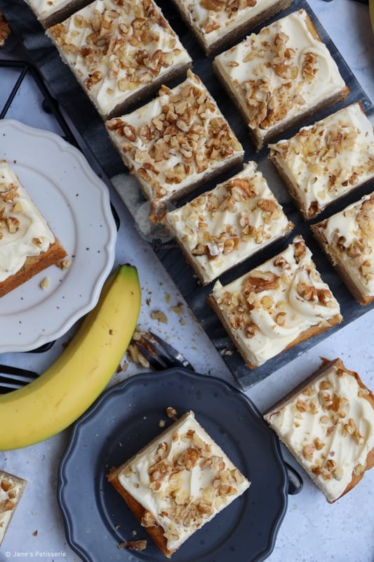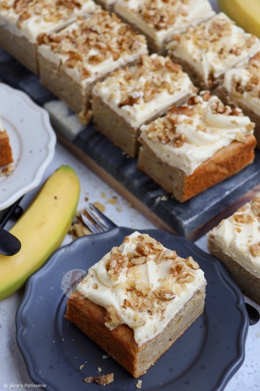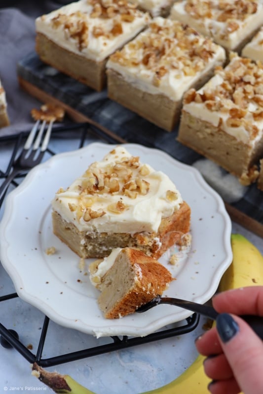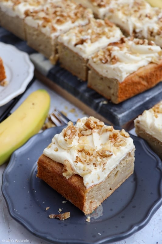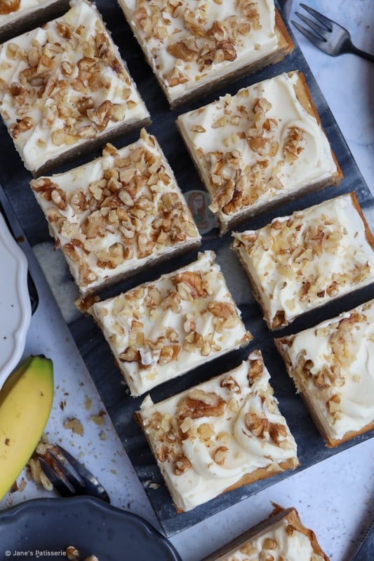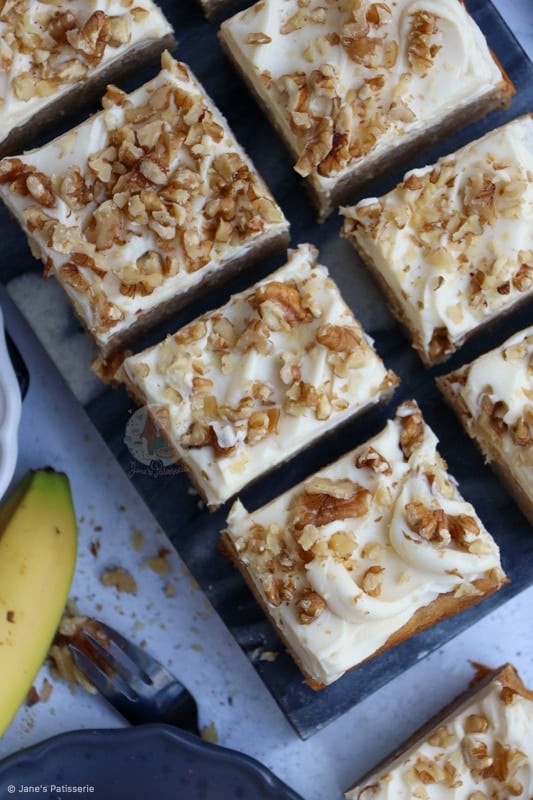 A deliciously tasty banana traybake cake with cream cheese frosting and walnuts – easy and heavenly!