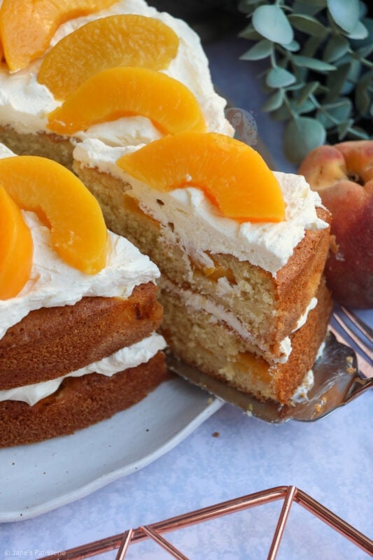 - If you use fresh peaches, you can use a simple syrup to drizzle on the sponges (dissolve 75g of caster sugar into 75g of water, and let it cool), or you can just leave it off