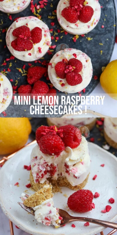 Mini lemon & raspberry cheesecakes with a biscuit base, lemon and raspberry cheesecake filling and even more delicious!