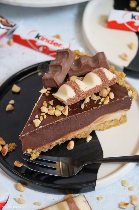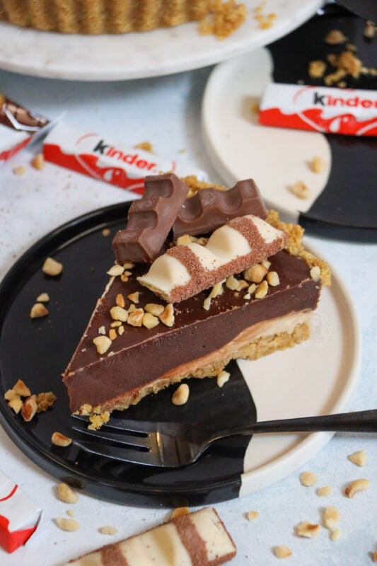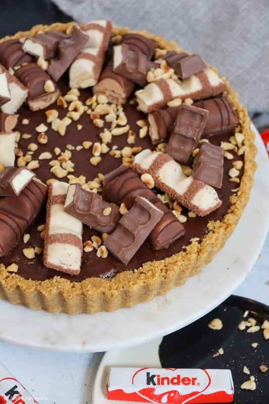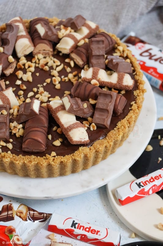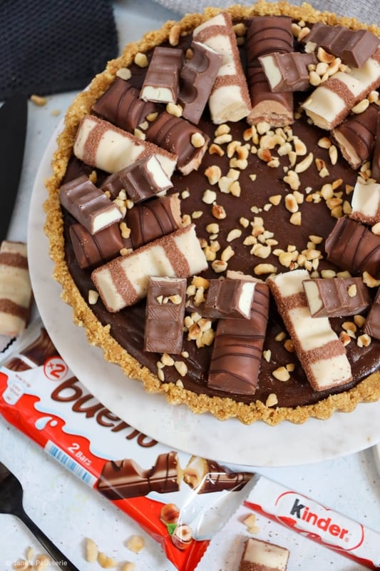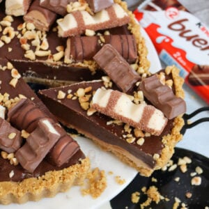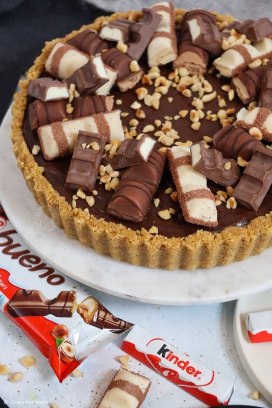 A delicious no-bake kinder bueno tart with a biscuit base, white chocolate hazelnut filling, hazelnut chocolate ganache and more…