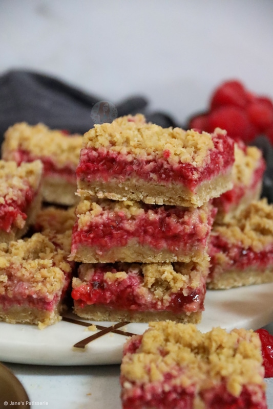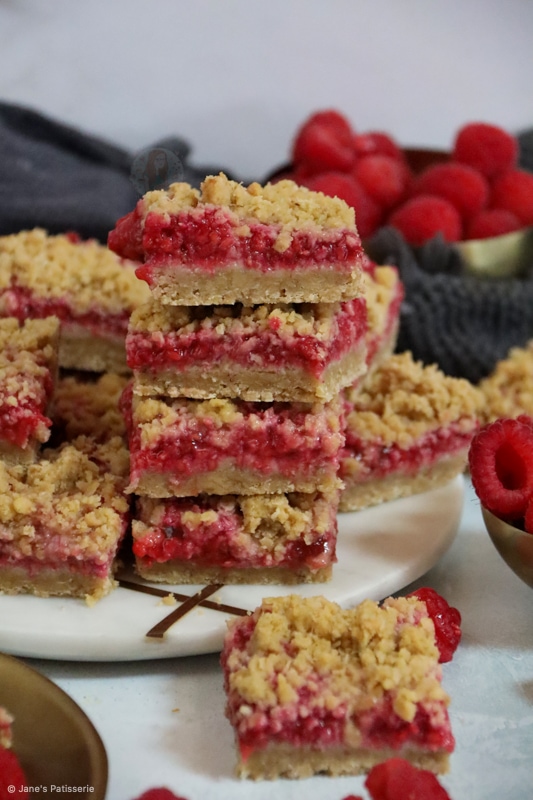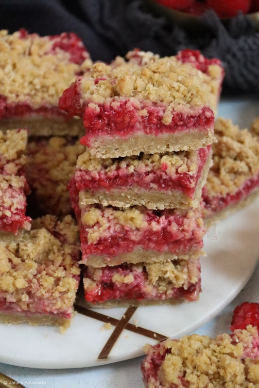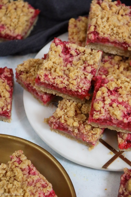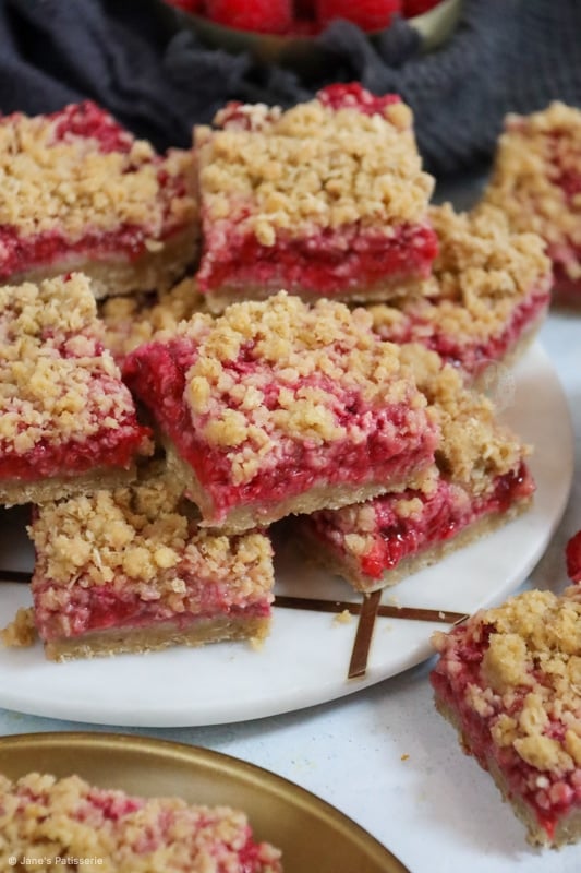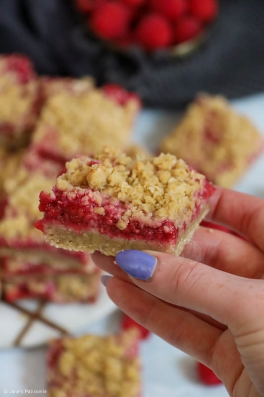 Fruity and delicious raspberry crumble bars with an oaty crumble base, raspberry filling, and even more delicious crumble on top!