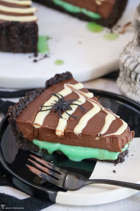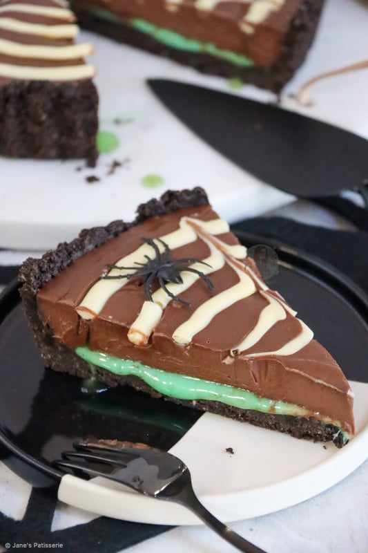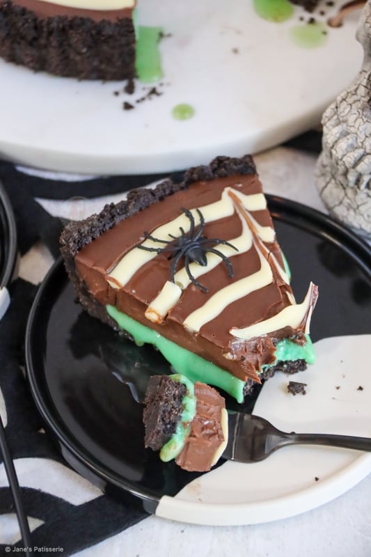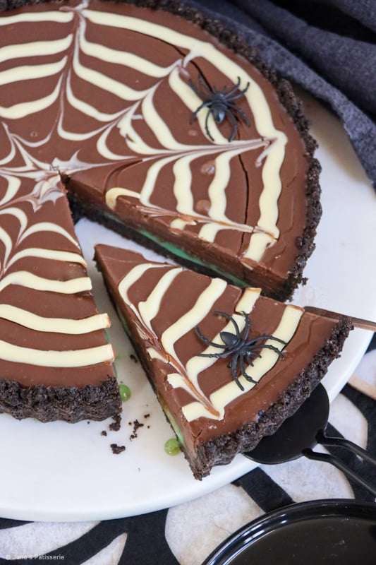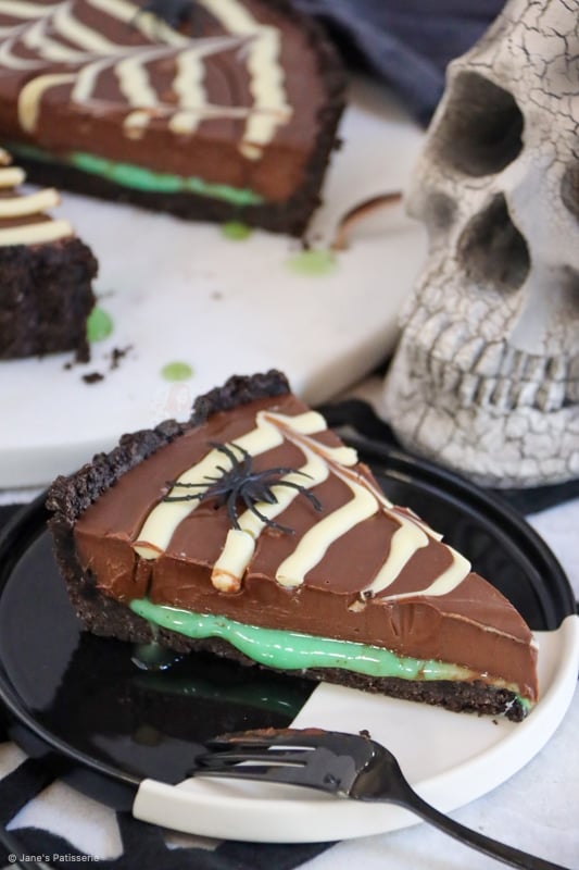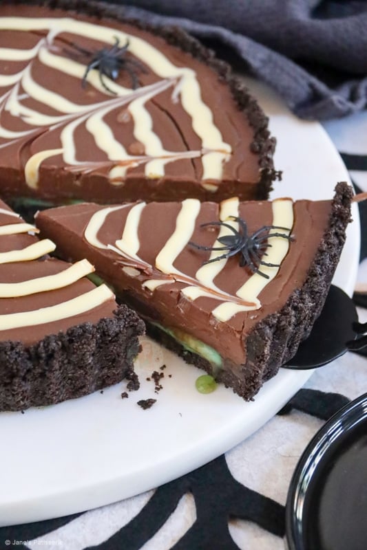 A delicious and spooky spider web tart with a biscuit base, slime mint filling, chocolate ganache and spider web… spooktacular.
