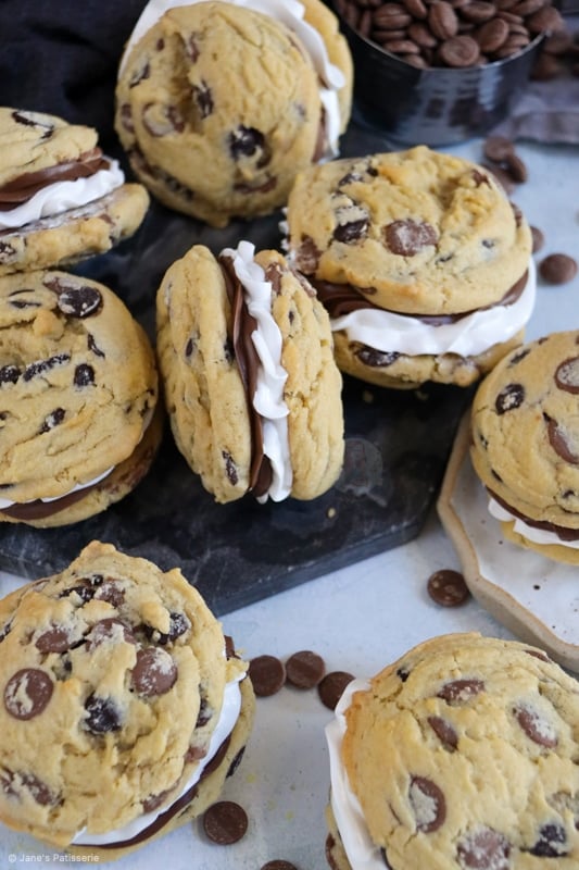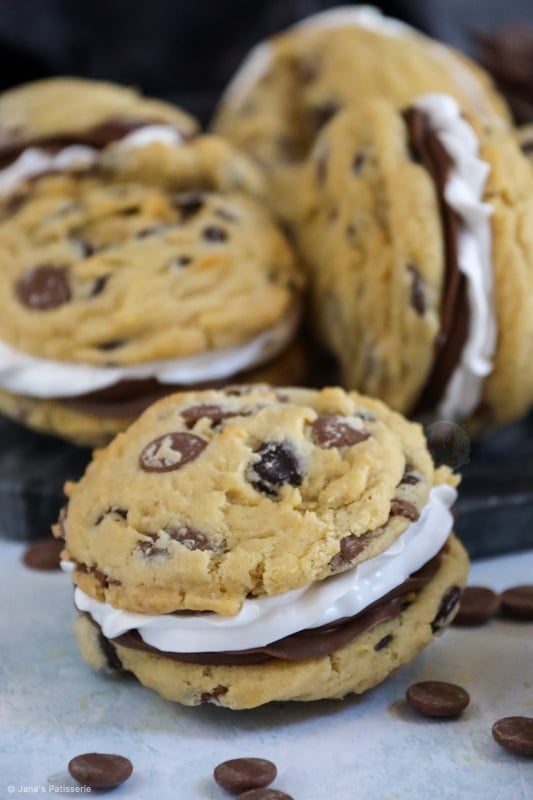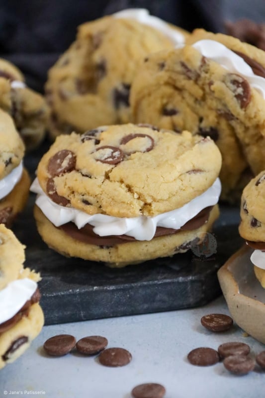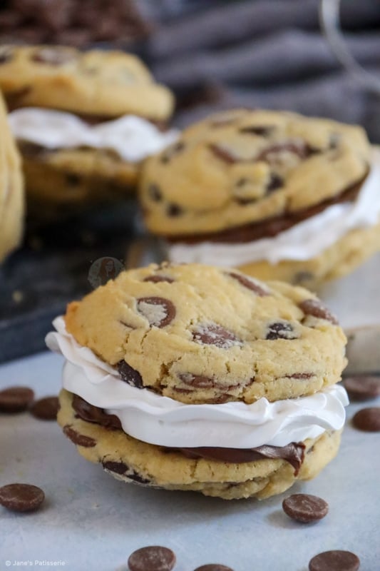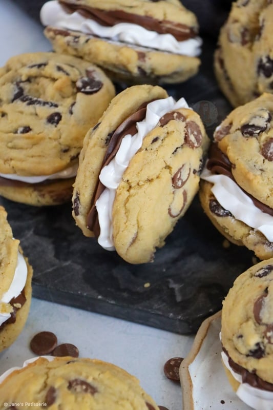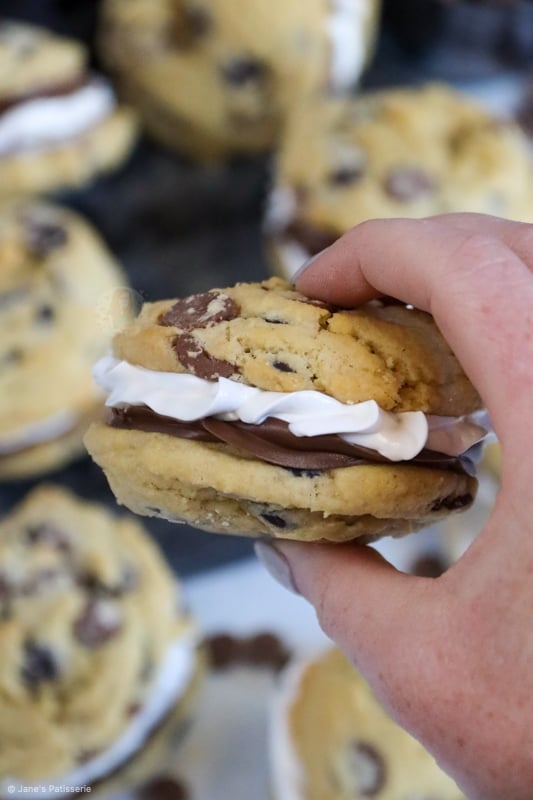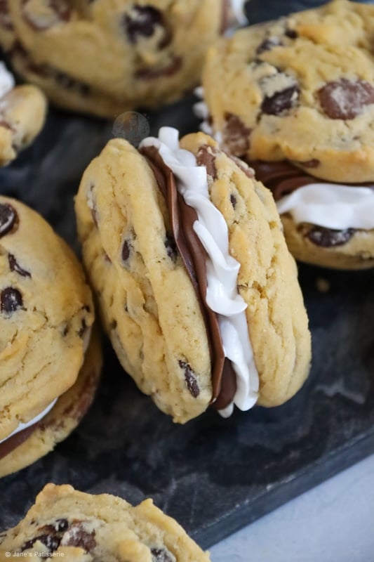 The cookie dough is a basic chocolate chip cookie that you can get from my NYC chocolate chip cookie recipe, or other cookies on my website. They’re measured with a 5cm scoop to bake to get a consistent size of cookie. You don’t want them too large as you have to sandwich two cookies together and that really would be overload if you used NYC size.