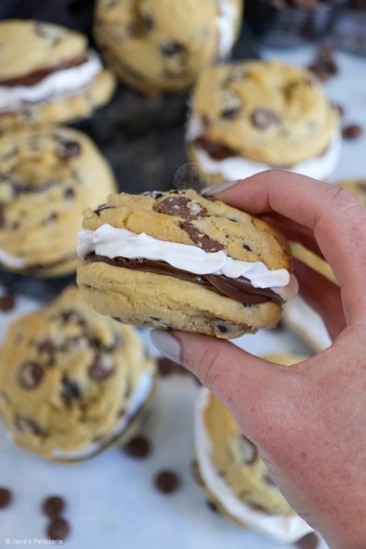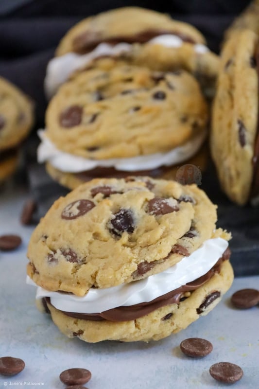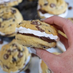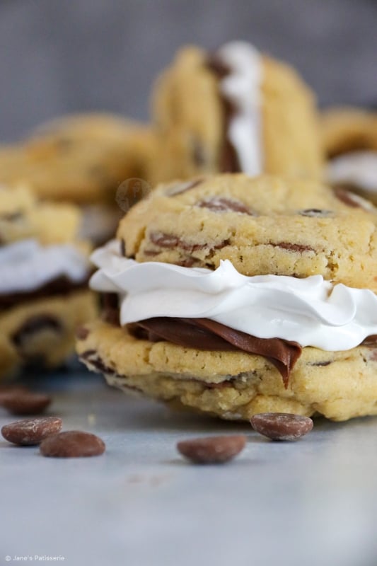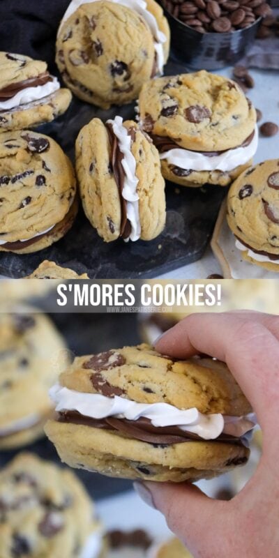 Easy to bake chocolate chip s’mores cookies stuffed with a homemade marshmallow and chocolate spread – YUMMY!