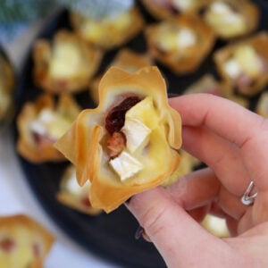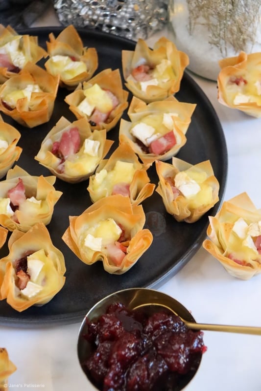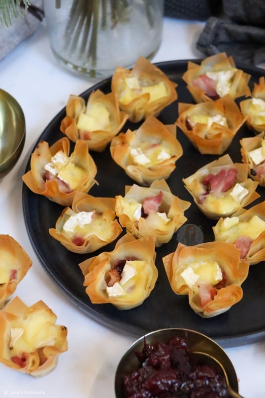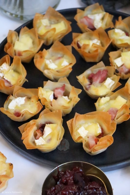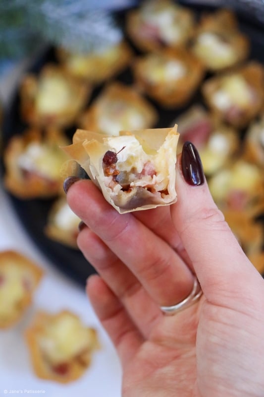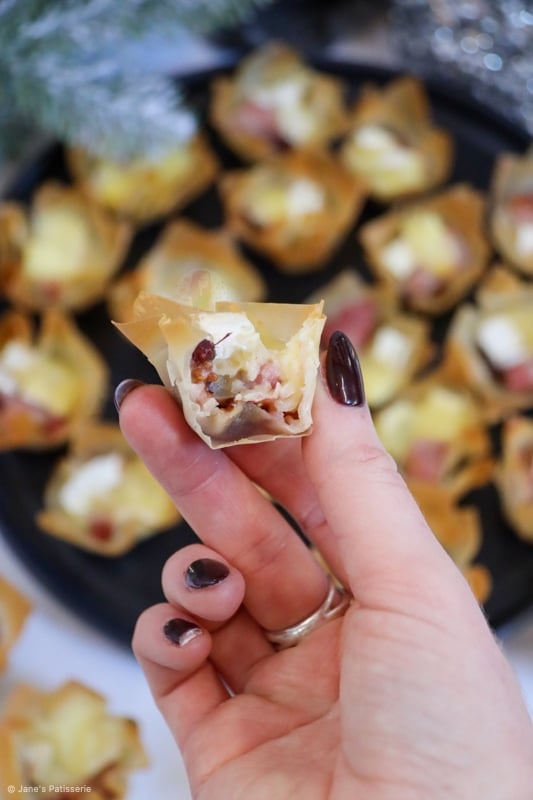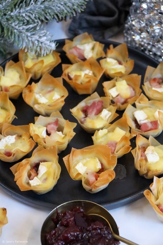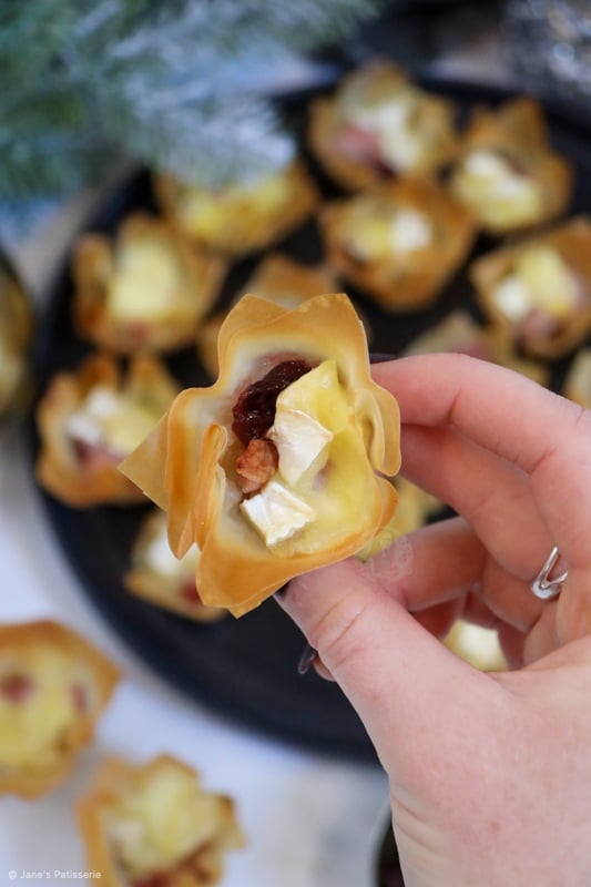 Delicious easy bitesize brie and bacon bites with cranberry and filo pastry cases – delicious snack for the festive season!