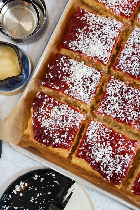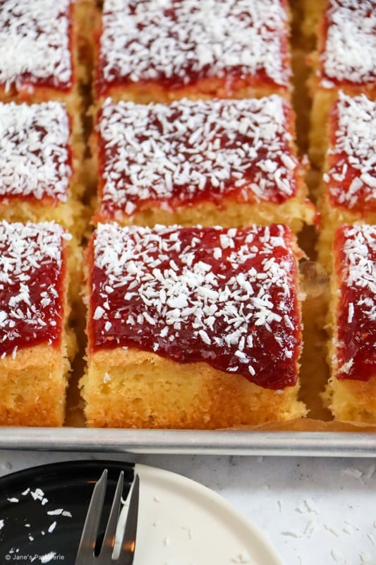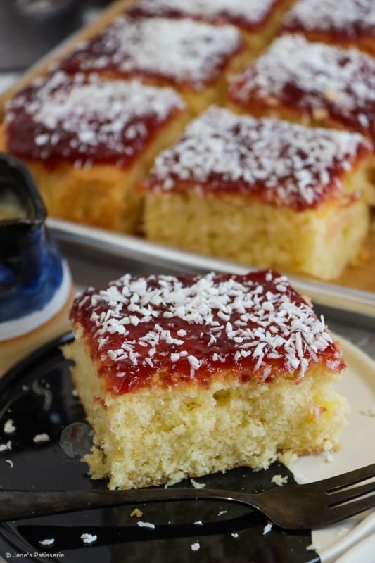 An easy and delicious jammy coconut traybake cake with a coconut sponge cake, your favourite jam and even more coconut on top!