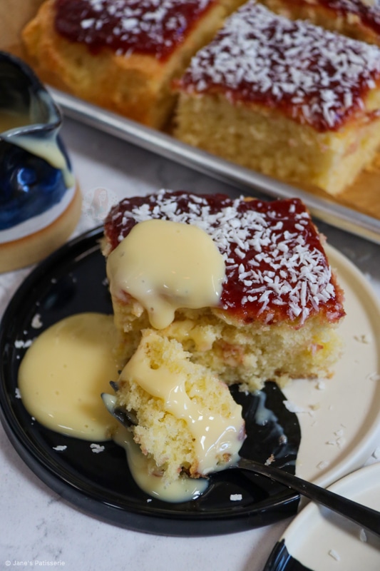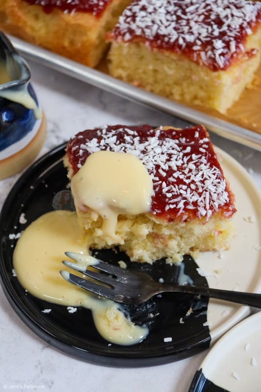 Delicious coconut sponge, raspberry jam (but obviously use your favourite!), and even more coconut on top served with a glue of custard… what more could you want?