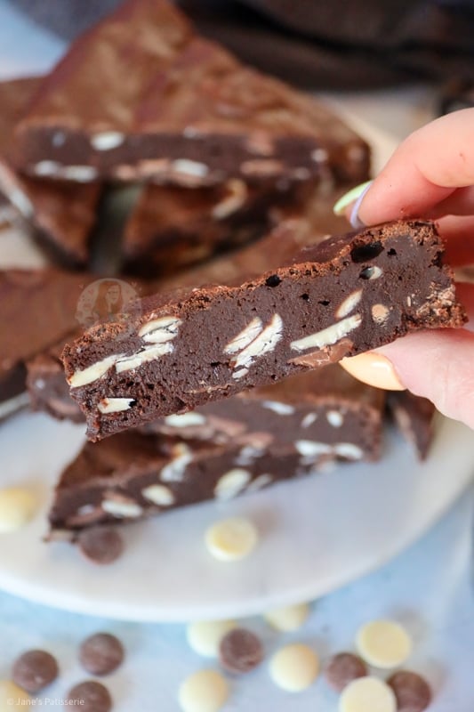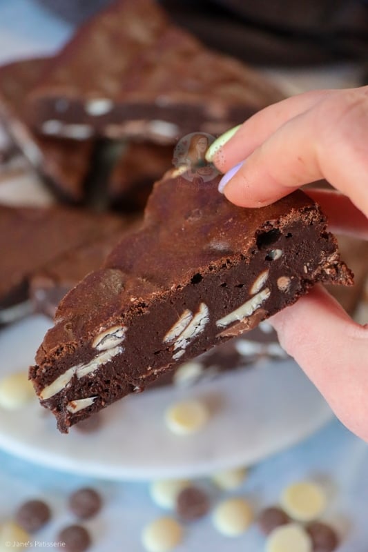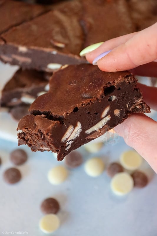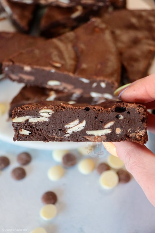 - Make sure to use dark chocolate in the base brownie, but the chips can be whatever flavour you fancy