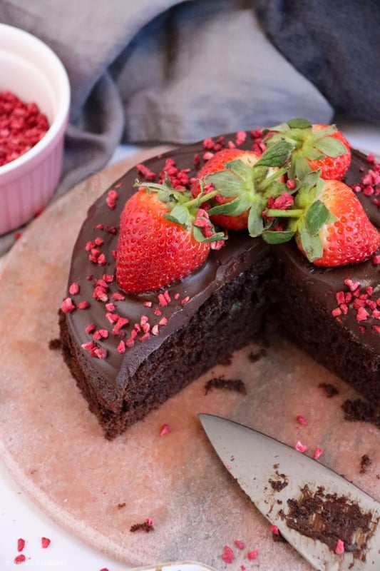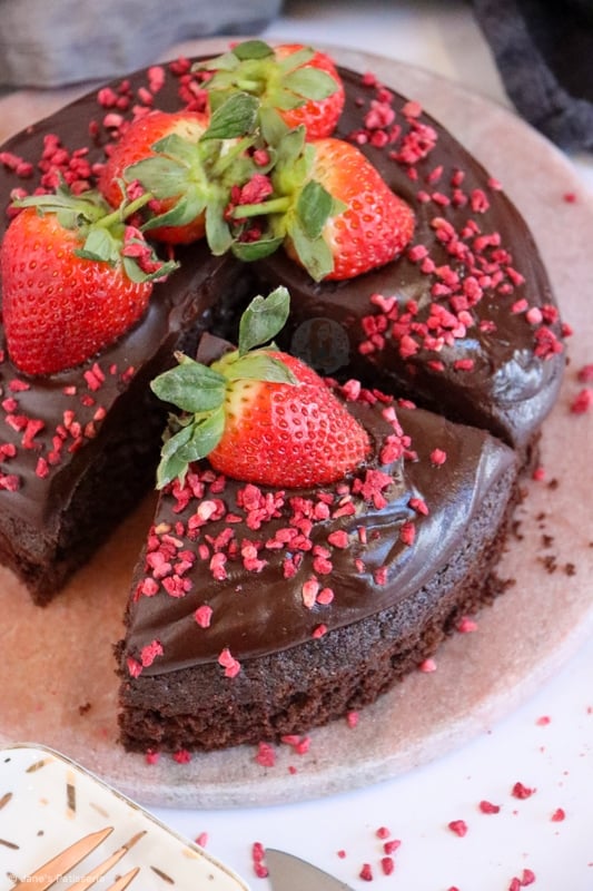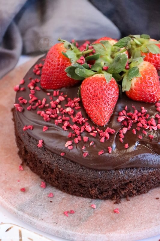 You can decorate your chocolate cake for two however you like, I just went for some fresh berries and freeze dried raspberries because it looks pretty, and chocolate and strawberries are a valentines match made in heaven.