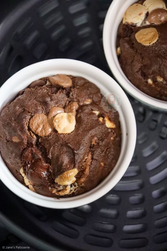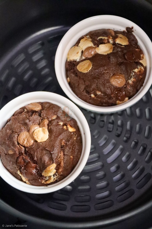 However, when baking in the air fryer, the chocolate chips you put on top do singe slightly so some chocolate may melt/explode a bit more than regular chocolate chips.