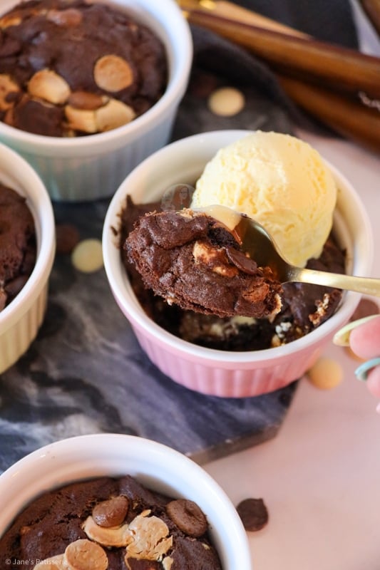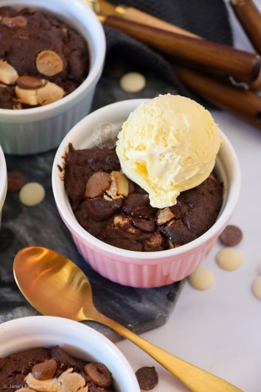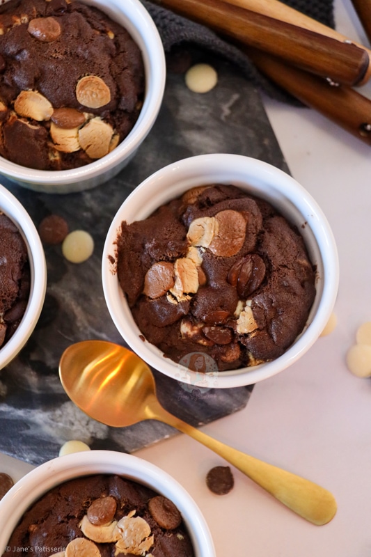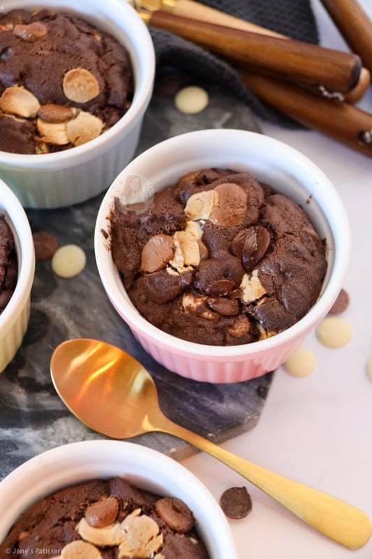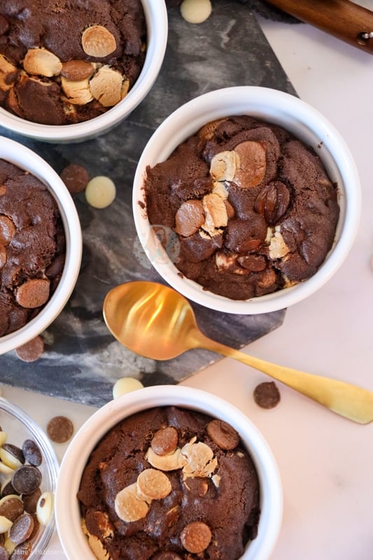 My triple chocolate cookie dough desserts are the main inspiration for this air fryer cookie dough pots as I was craving a chocolate cookie. All I did was split the two cookie dough desserts into four ramekins and then bake in the air fryer.