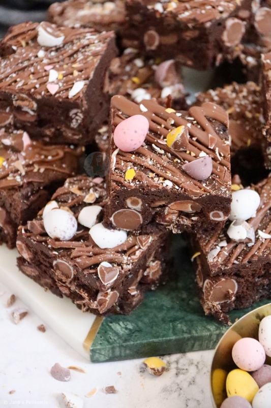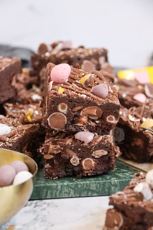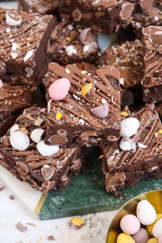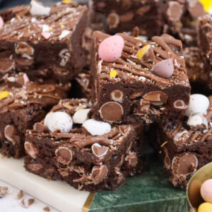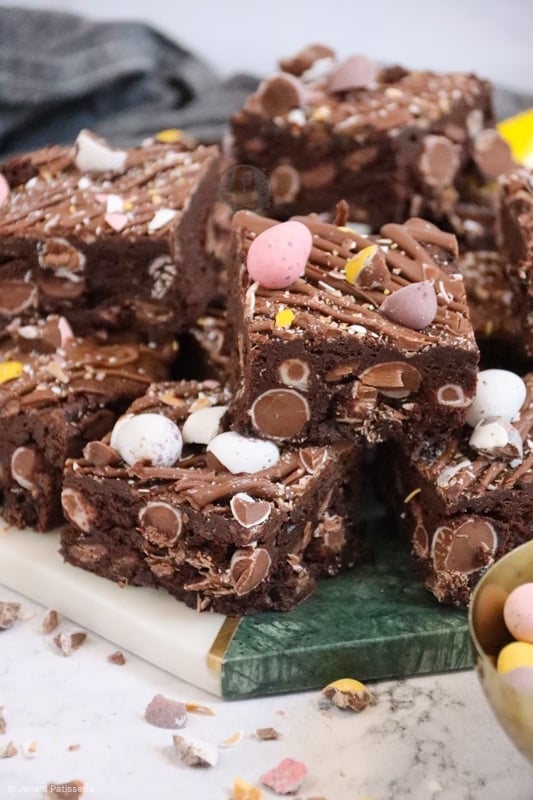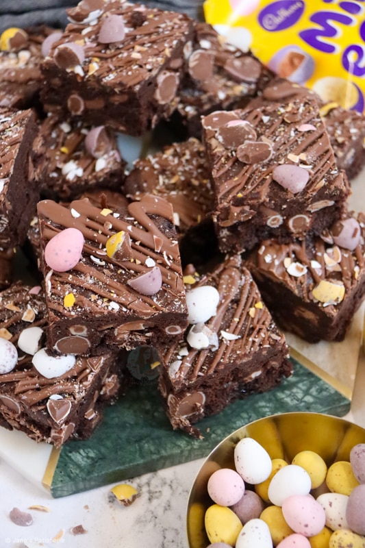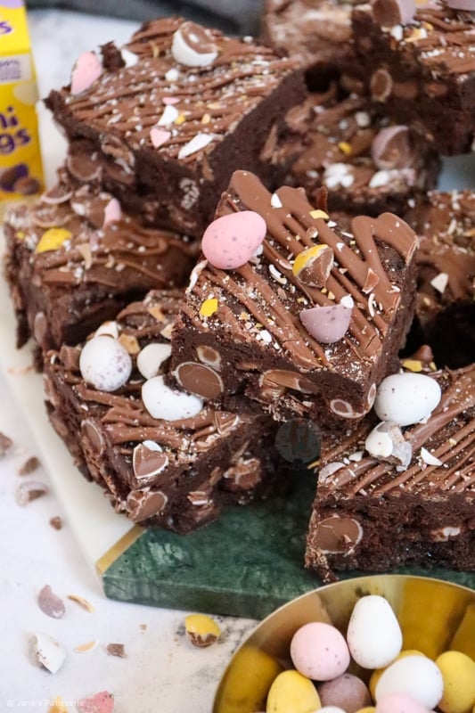 Deliciously chocolate mini egg brownies with a thick fudge brownie, stuffed with mini eggs and chocolate chips, topped with even more!