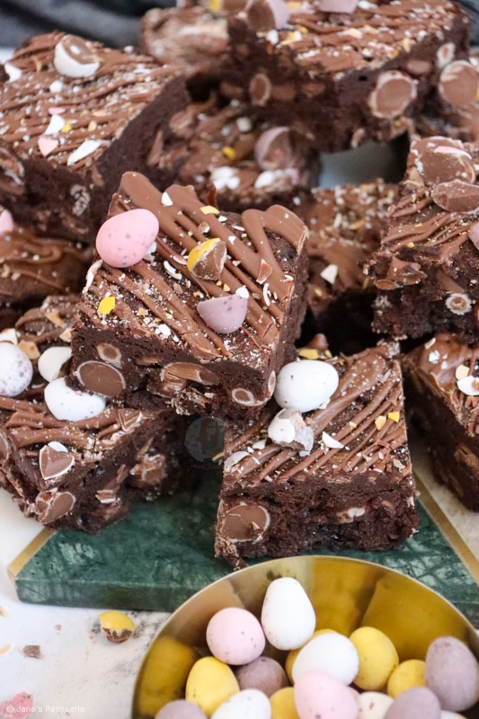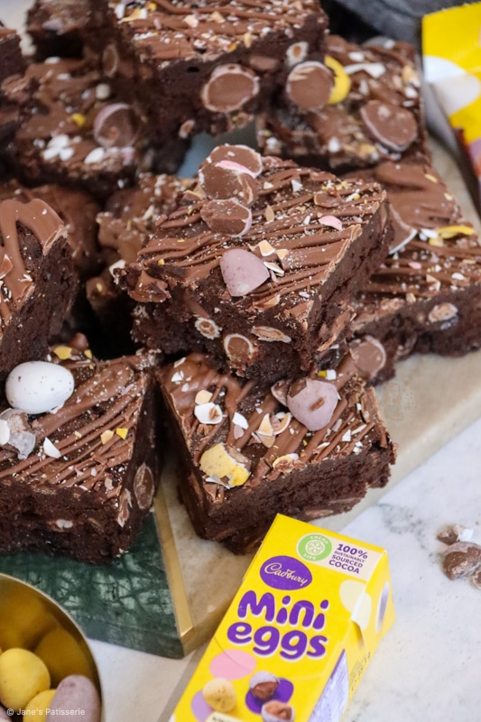 I used some melted milk chocolate to drizzle all over the brownies, and then sprinkled on some mini eggs. I often find crushed and chopped mini eggs are really pretty ‘sprinkles’ because they almost create a colourful chocolatey dust and it looks and tastes great.
