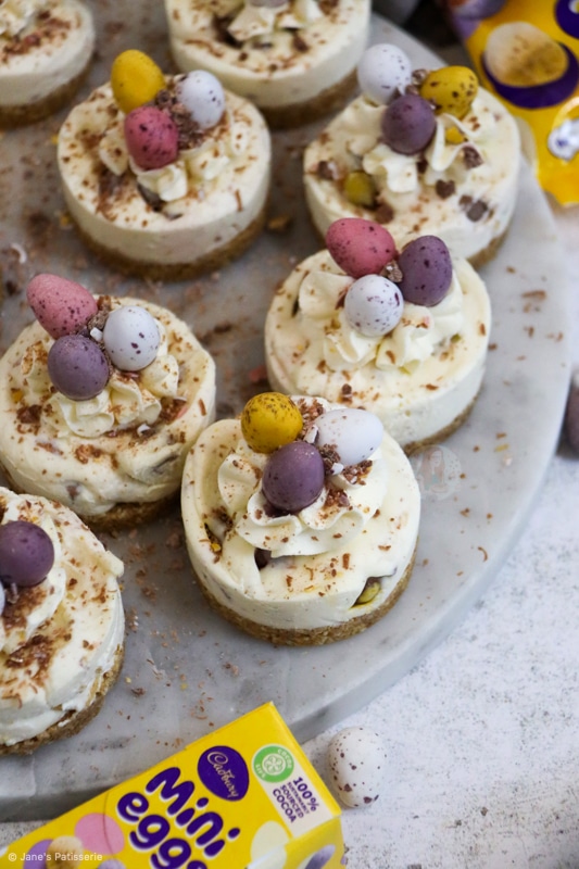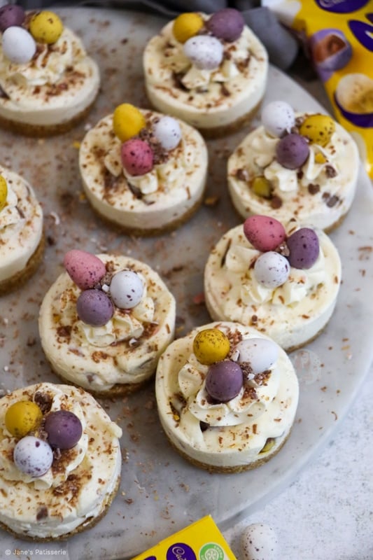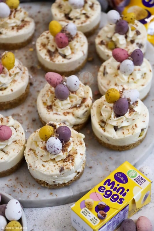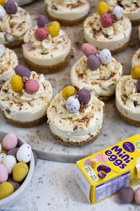 I love adding them to the insides of the cheesecake mixture in these individual mini egg cheesecakes, as well as decorating with them. Whole mini eggs on top, crushed mini eggs on top and inside – as many mini eggs as you can possibly fit all in one place.