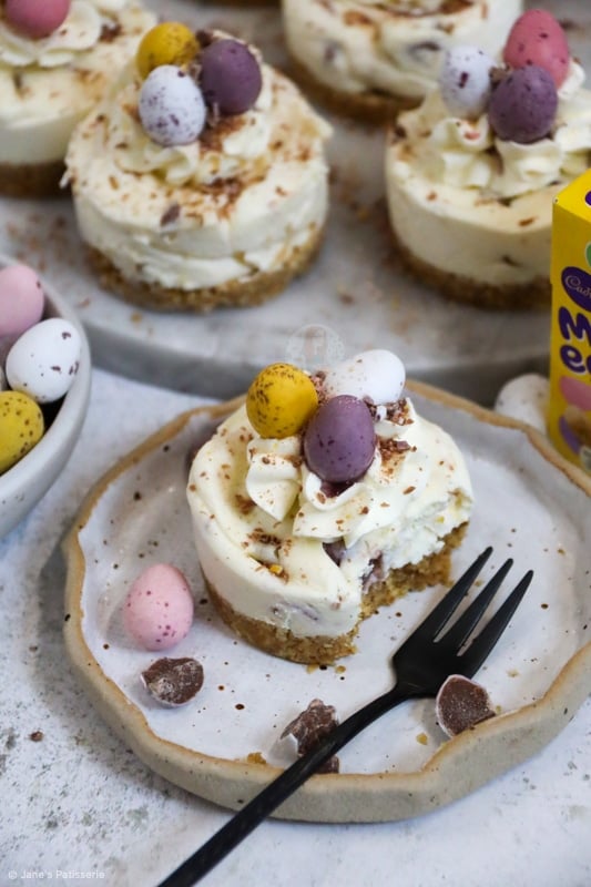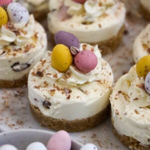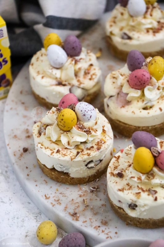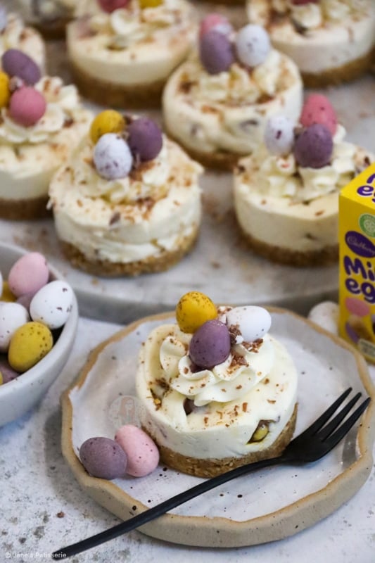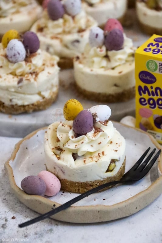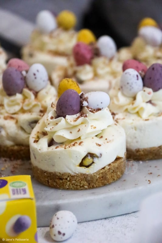 Individual mini egg cheesecakes with a buttery biscuit base, no-bake vanilla cheesecake mini egg stuffed filling, whipped cream and more!