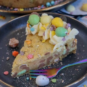 A delicious and easy to make giant easter cookie stuffed with easter chocolates, and decorated with buttercream and even more chocolate!