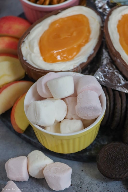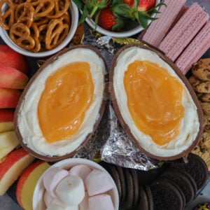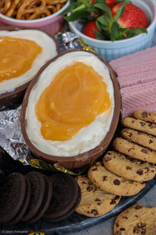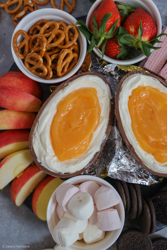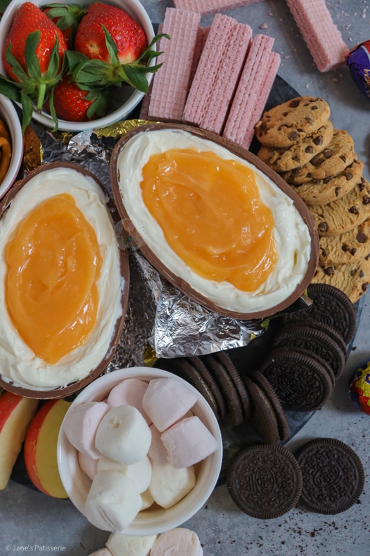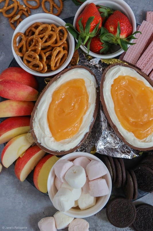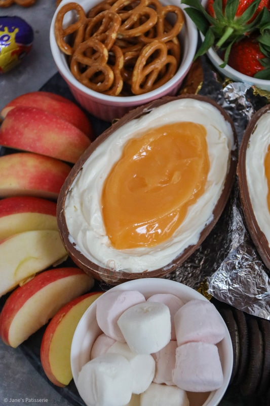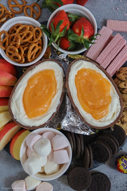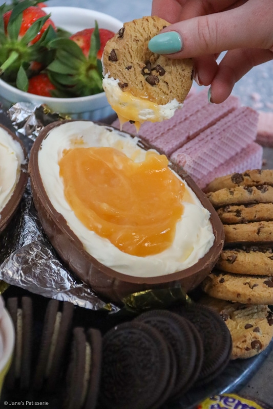 One of the key parts to this recipe, is the egg. You can easily just make this dip into a bowl if you preferred, you don’t need the egg… but I thought it gave it the Creme Egg look, and made it more fun. I used a large chocolate egg for mine, split in half.