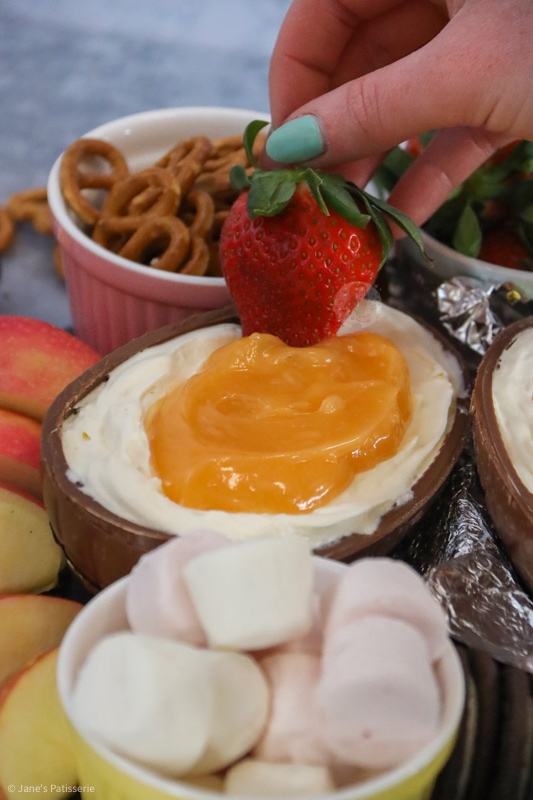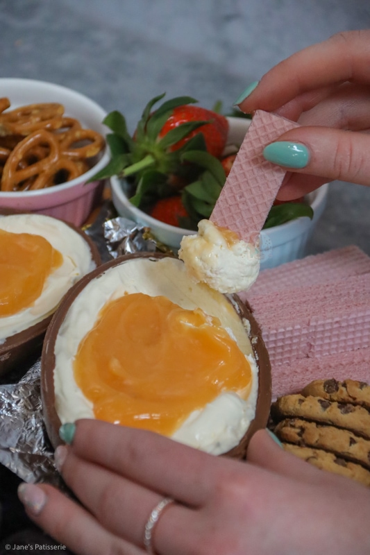 I think something such as a sweet dip isn’t made enough, and I want to bring them to the world of baking more and more. Cheesecake eggs are obviously a thing already, but I wanted to make this beauty into a sharing platter style dip recipe like my others; and just look at it!!