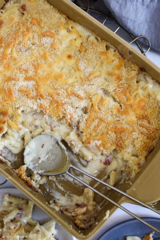 A deliciously cheesy macaroni cheese with homemade cheese sauce, crispy bacon and a breadcrumb topping… a homemade dinner idea that is easy and heavenly!