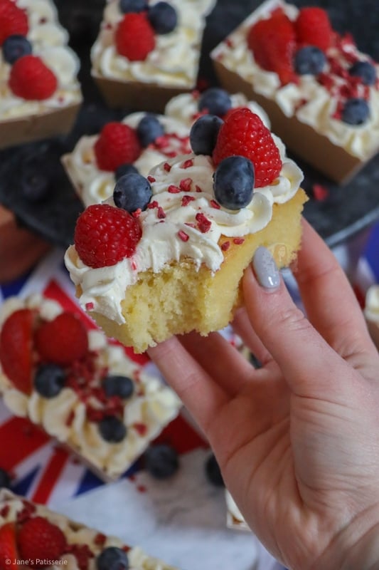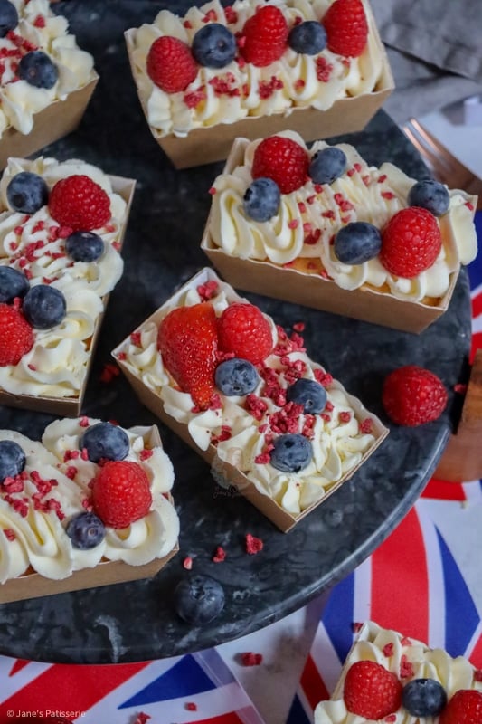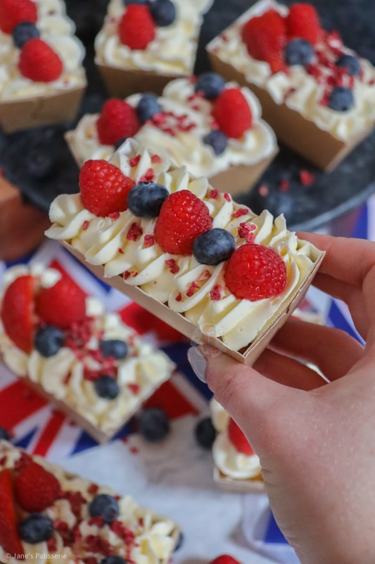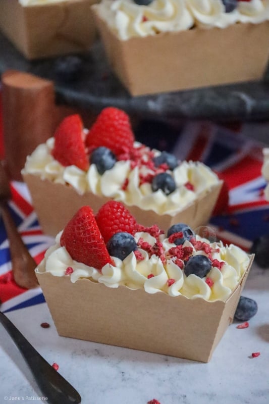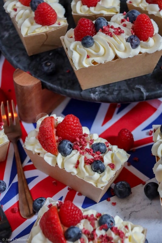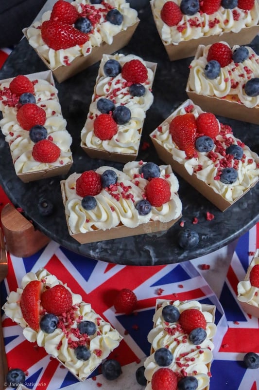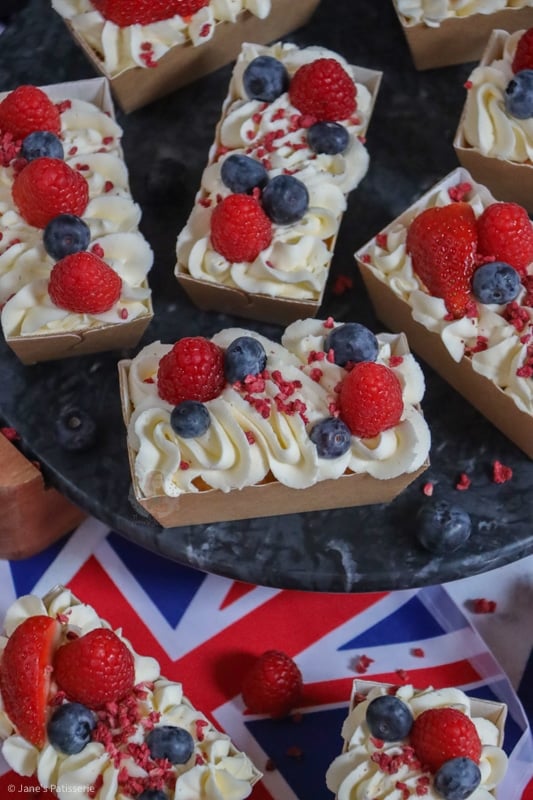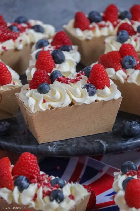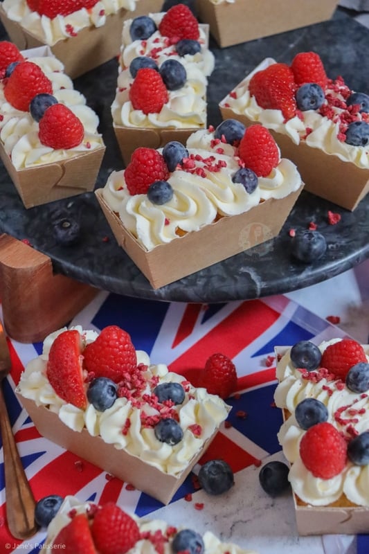 Mini coronation loaf cakes that are perfect for the coronation of King Charles. Lemon sponges, lemon frosting, and berries on top!