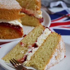 A coronation victoria sponge with freshly whipped cream, strawberry jam and a dusting of icing sugar – perfect for King Charles Coronation!