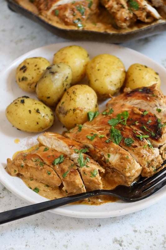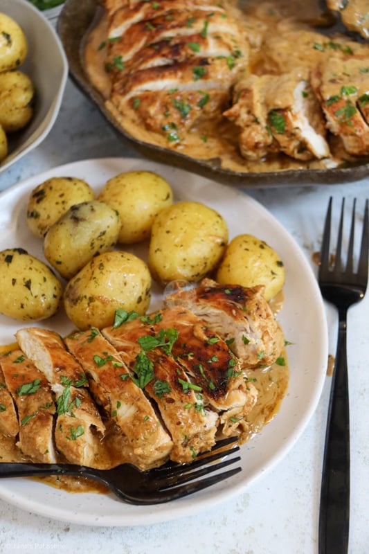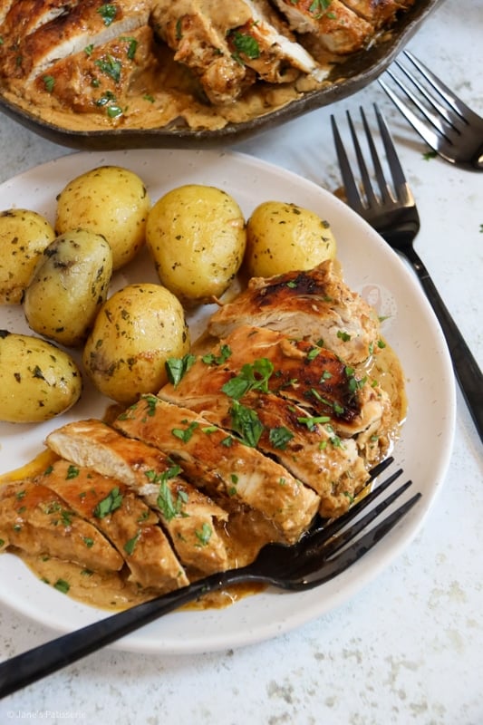 When it came to serving this, I did want I had… so I did new potatoes. Now, you can use whatever you want – mashed potatoes, chopped potatoes, salad, rice, anything you fancy! The main focus of this dish is the deliciously flavoured chicken and the sauce.