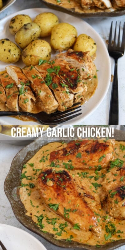 A deliciously easy creamy garlic chicken with a white wine cream cheese sauce, perfect for lunch and dinner.