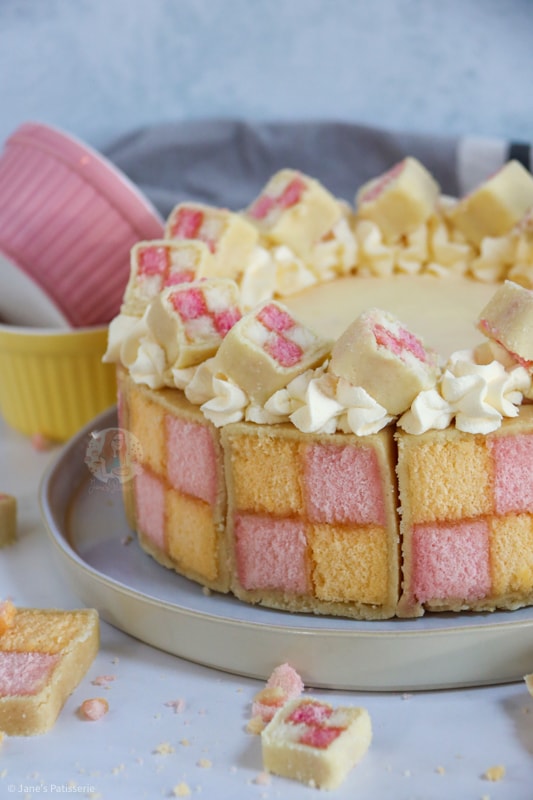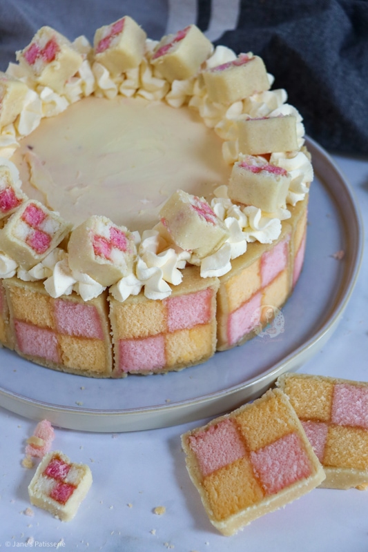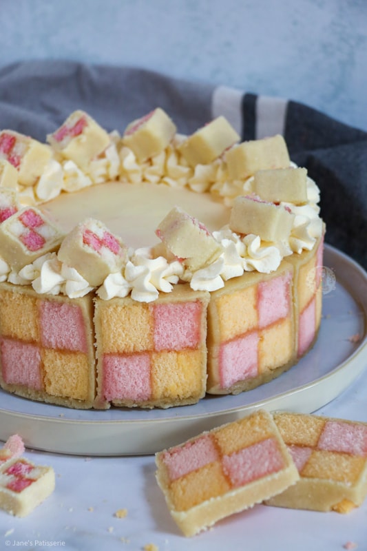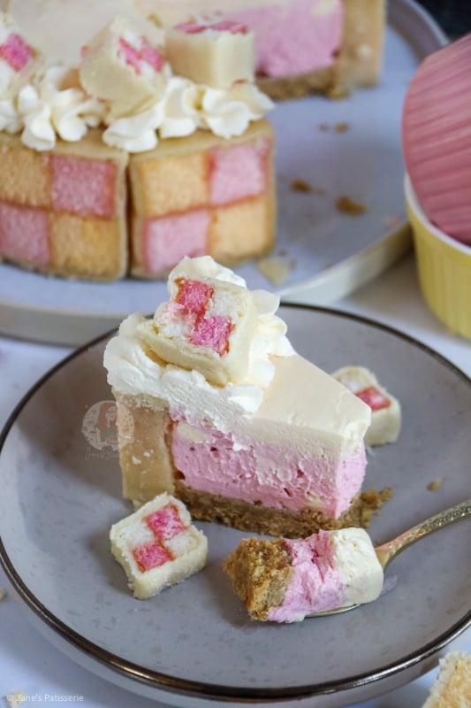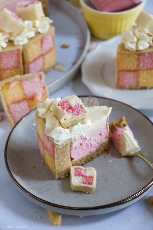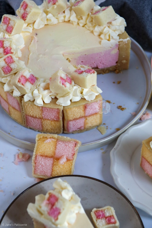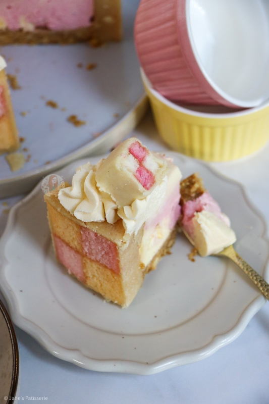 As the cheesecake is super easy to get in and out of the tin with the cake shell, it makes the decoration really quick and easy as well. I went for a simple decoration of sweetened whipped cream with slices of mini Battenberg cakes because it looked damn cute.
