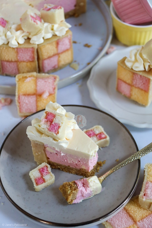 A delicious no-bake Battenberg Cheesecake with a Battenberg shell, biscuit base, almond and jam flavoured cheesecake filling and more.