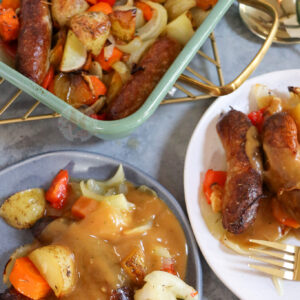 A delicious and easy favourite for so many households, a throw together sausage traybake that’s perfect for dinner!