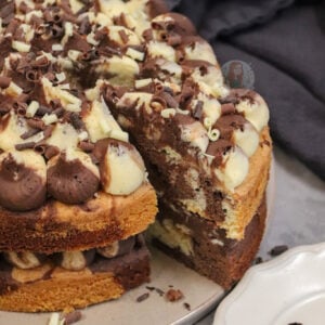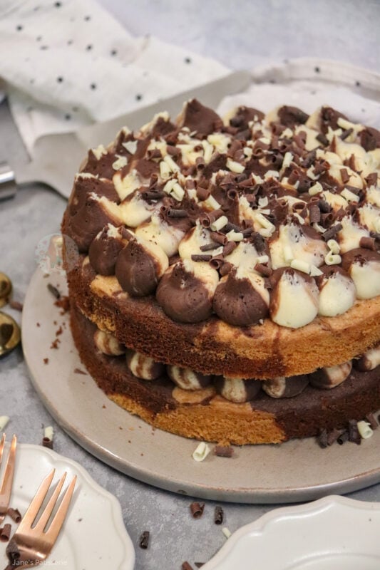 A simple two layer vanilla and chocolate marble cake with chocolate and vanilla swirled buttercream frosting and more