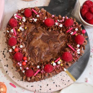 A delicious heart shaped valentines brownie with chocolate chips, a Nutella swirl, and even more chocolate decoration on top! Perfect valentines bake.