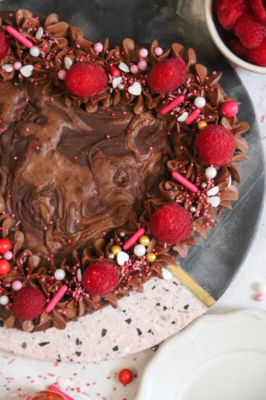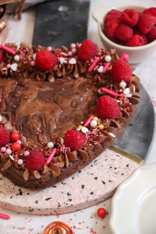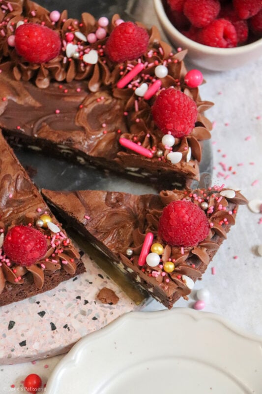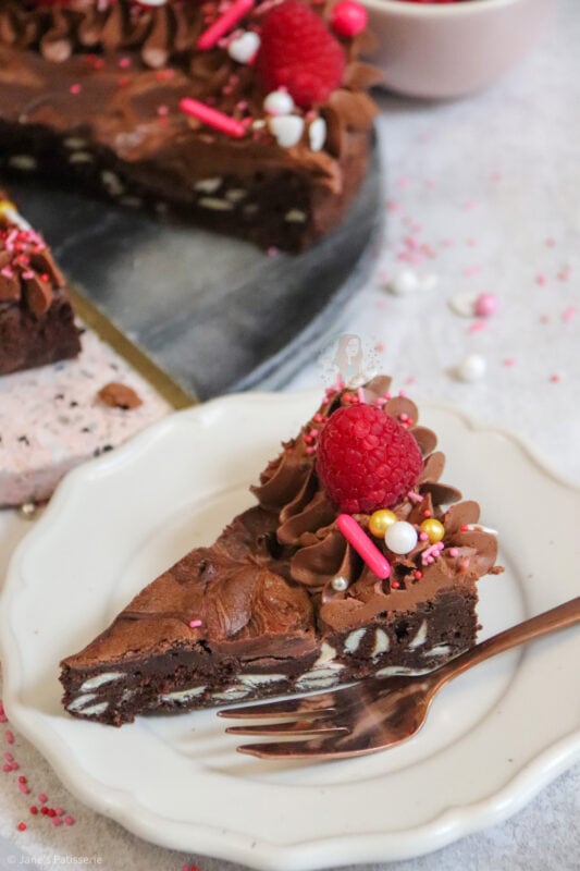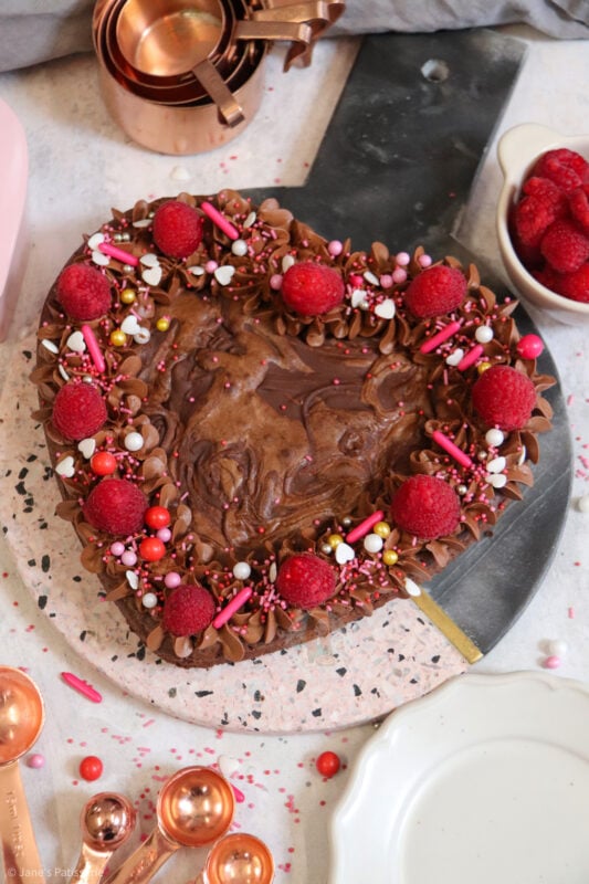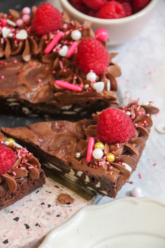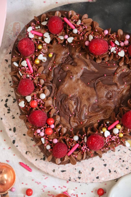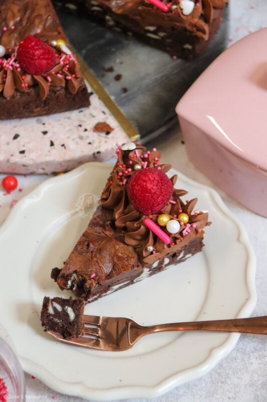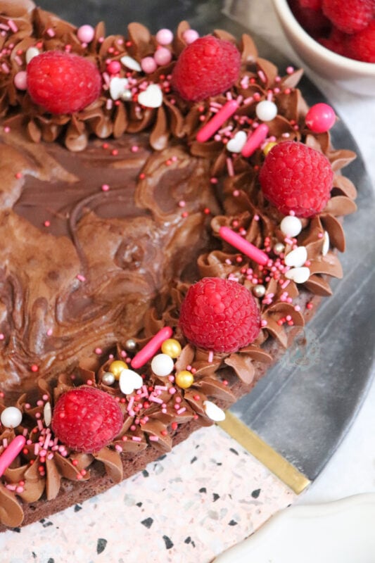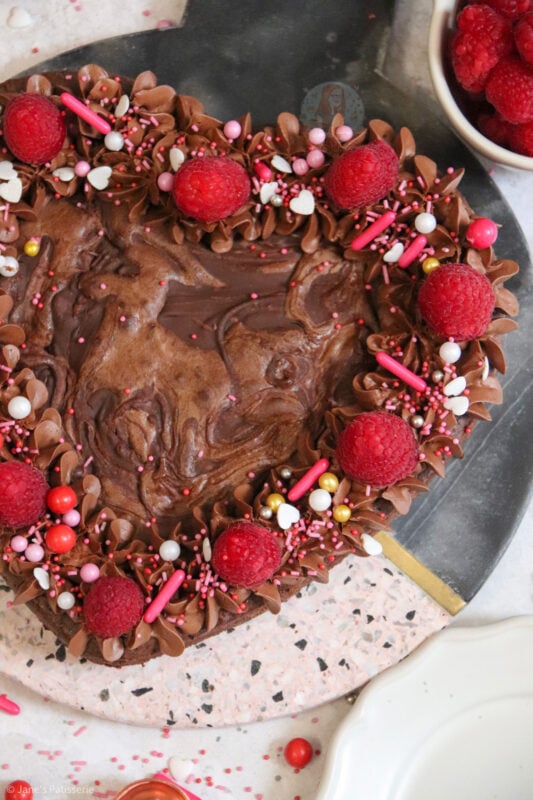 When it came to decorating this brownie, I went relatively simple because I really didn’t know what to choose! In my giant valentines cookie recipe I use a pink buttercream so I didn’t want to do that again. I sort of wanted to really wham the chocolate into this one.