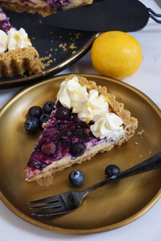 I sprinkled over some extra lemon zest as well, but you of course leave this off or add even more blueberries. The decoration is a balance of sweetness as well as just finishing off the tart.