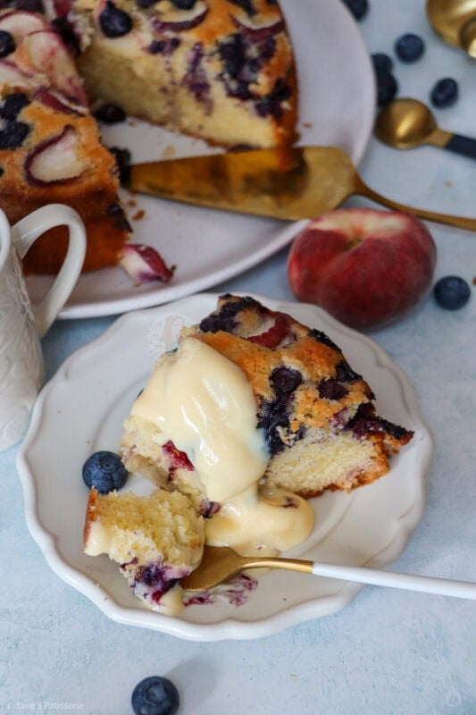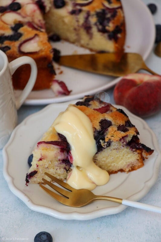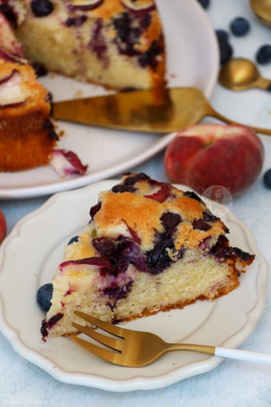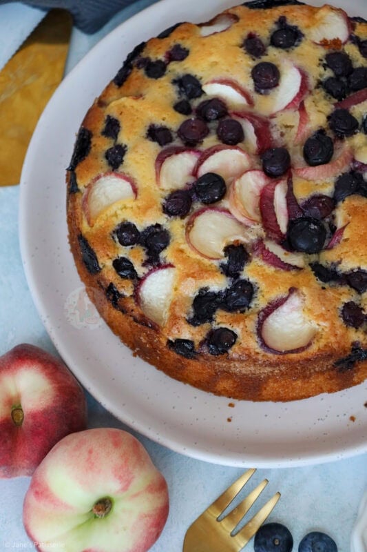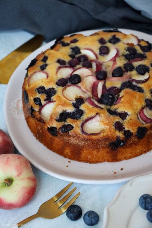 A deliciously sweet and simple peach and blueberry cake with a simple vanilla sponge, topped with fresh peach slices and blueberries