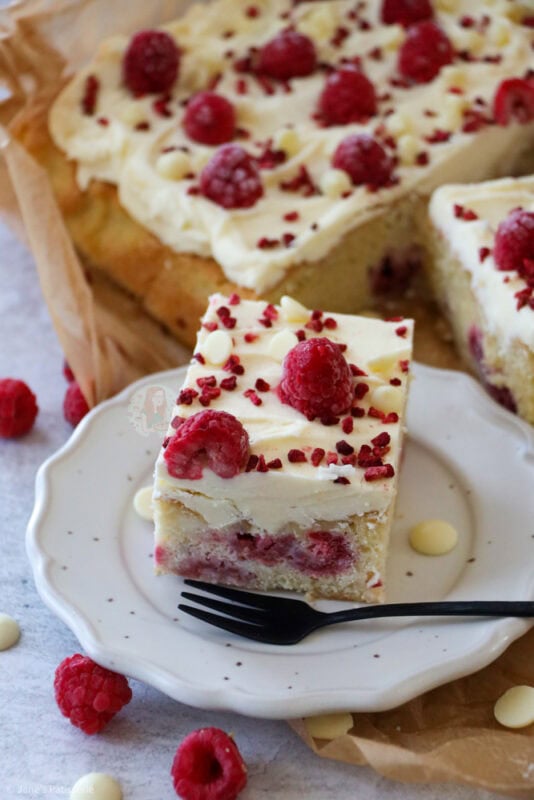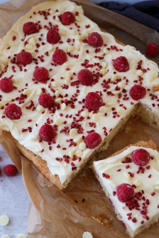 A deliciously simple white chocolate raspberry traybake cake with a white chocolate raspberry sponge and delicious decoration on top!