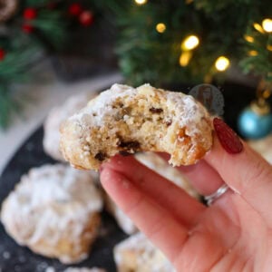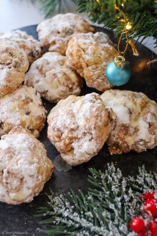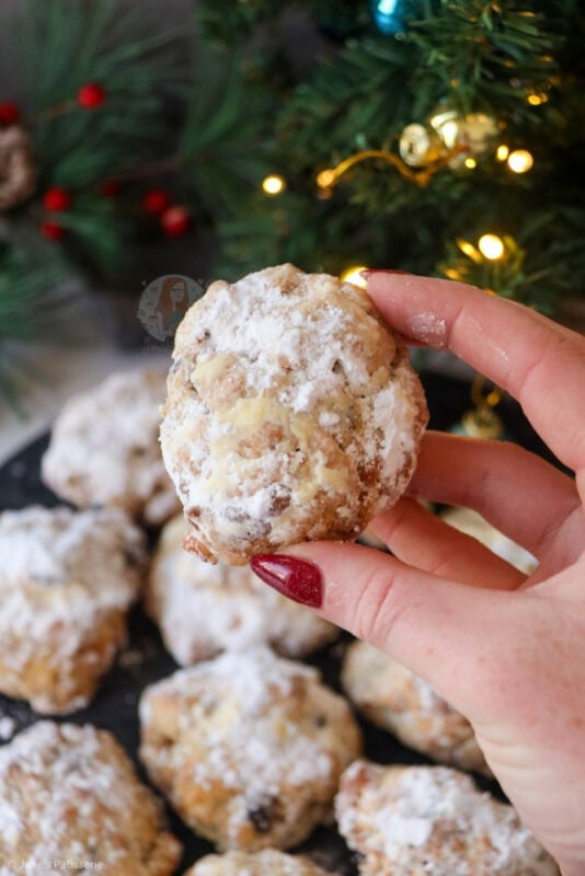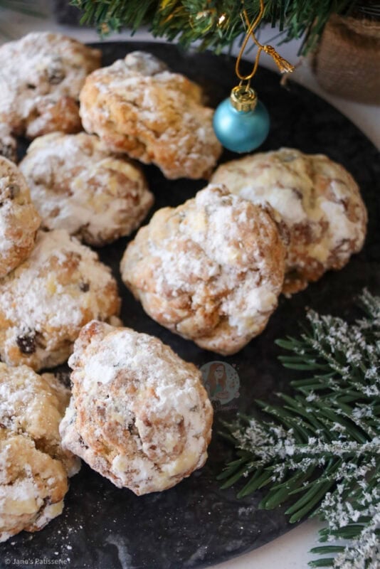 Delicious stollen bites made with marzipan, dried fruit, and dusted with icing sugar for the perfect festive treat