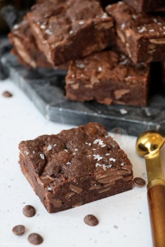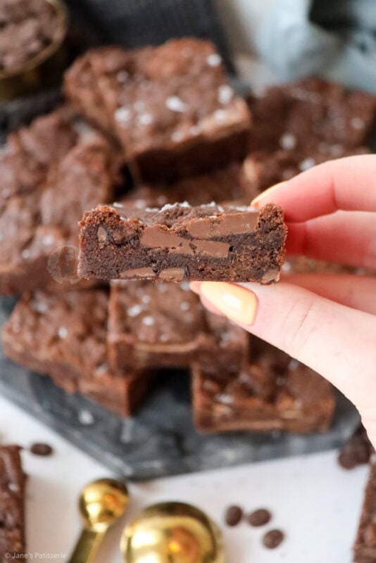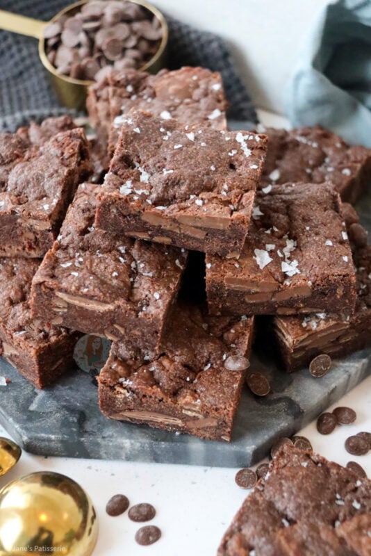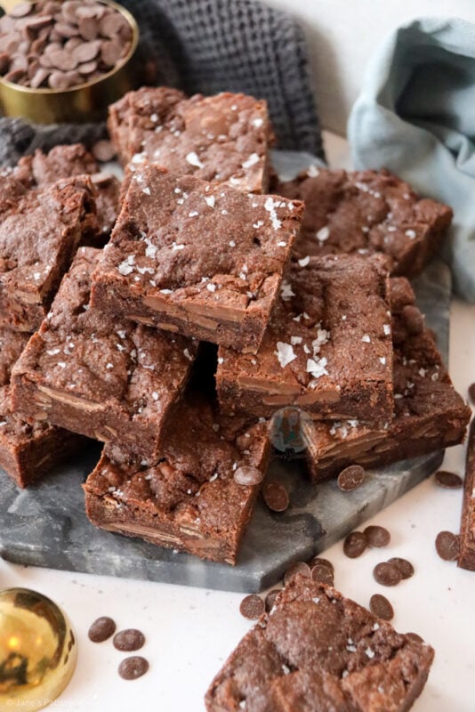 Deliciously easy vegan cookie bars with a chocolate base, chocolate chunks and a sprinkle of sea salt – perfection