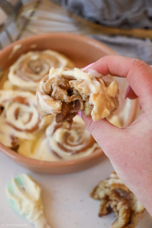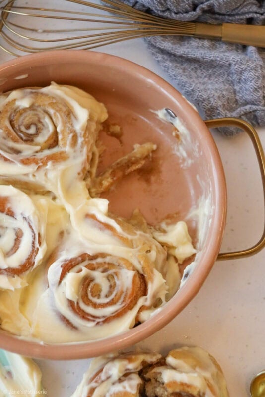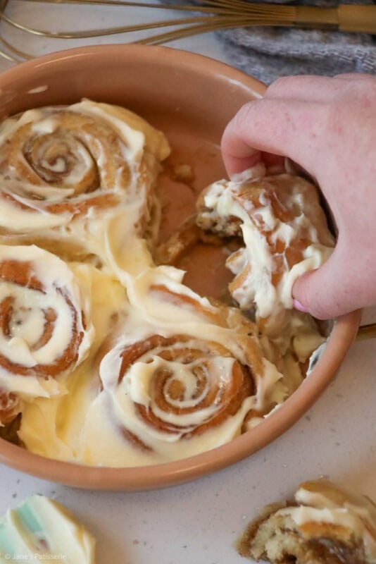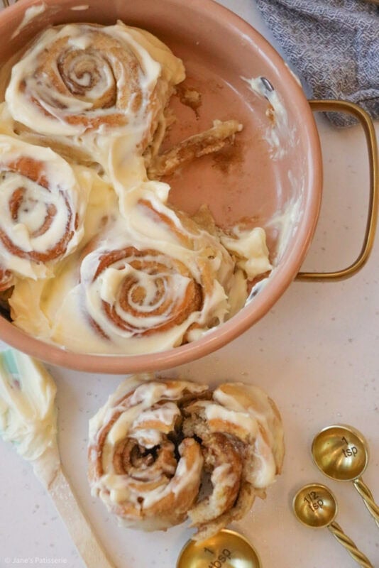 The baked cinnamon rolls are glorious when they are fresh out of the oven, smelling deliciously warm and cosy and I adore it. However, I love slathering a frosting on top – and whilst my regular cinnamon rolls have an icing drizzle, I do love the classic cream cheese frosting topping.