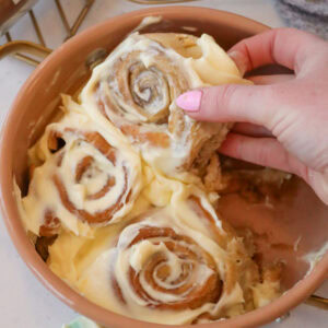 - Add the cream cheese and vanilla and mix. Spread over the cinnamon rolls