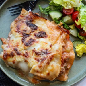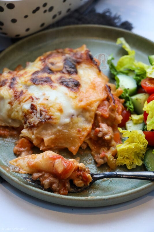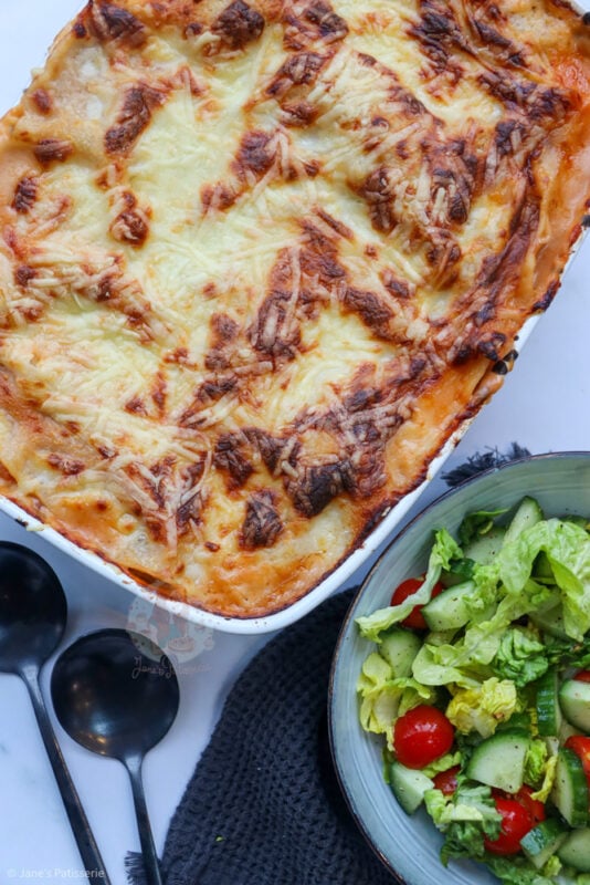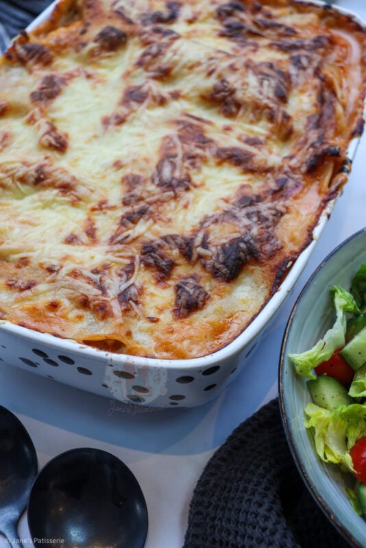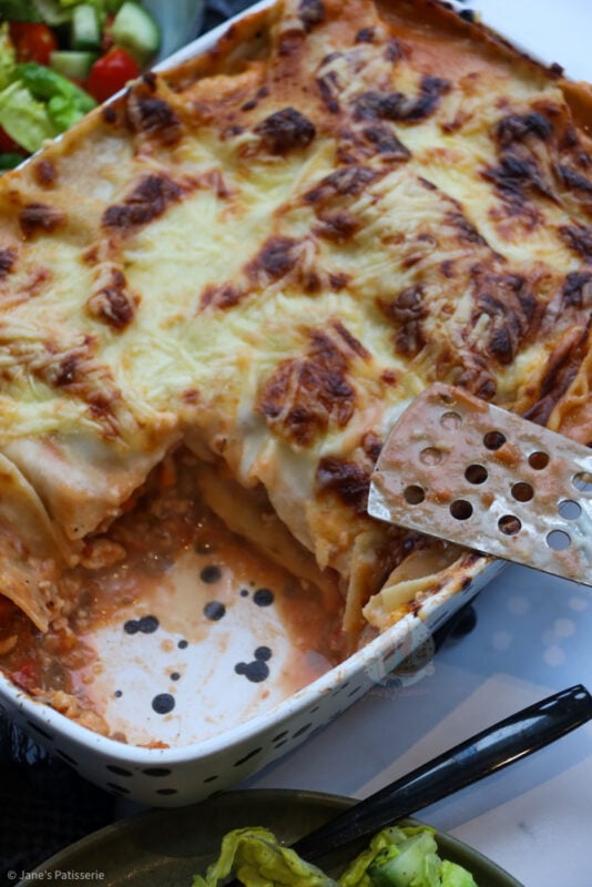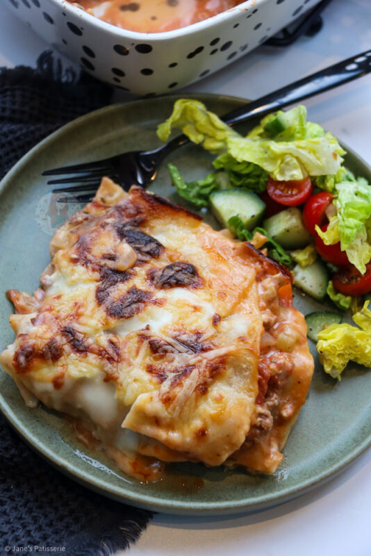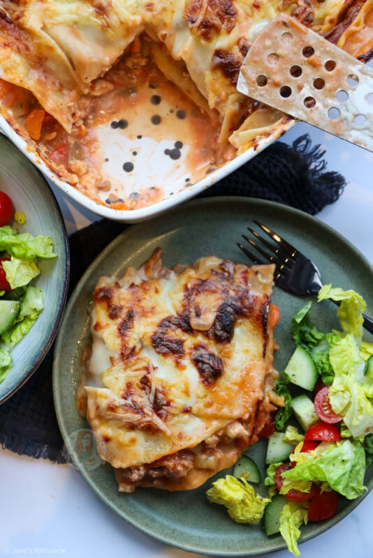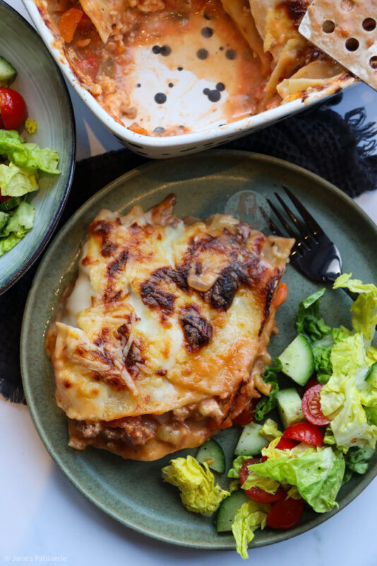 This recipe use a tomato and meat bolognese filling, with a homemade cheese sauce, and the large flat pasta sheets. This is traditionally how I ate it growing up, and how I have also made it. It’s a purposefully simple recipe, and even though the ingredients list seems quite long it’s as simple as I can make it, whilst also being incredibly delicious still.
