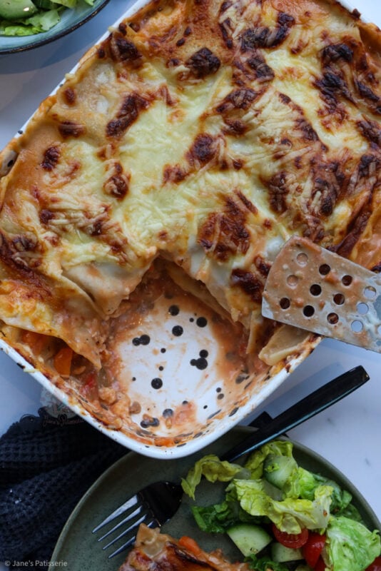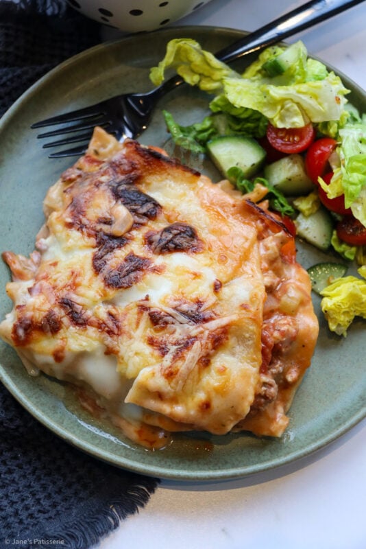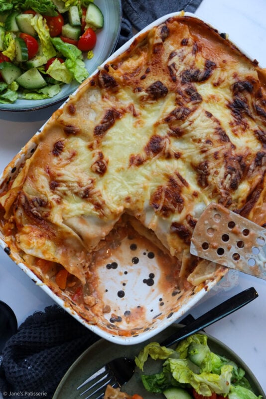 I bake in my oven until it’s golden, bubbly and delicious – and I love to serve this lasagne with garlic bread, some salad, or just devour it as it is. It’s 100% one of my favourite things to eat, and make, and I hope you love this recipe.