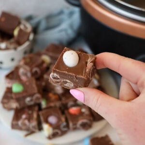 - If you don’t have a slow cooker you can make this fudge by melting the chocolate and condensed milk in a bowl in the microwave on low, stirring often until smooth – or super low on the hob in a pan.