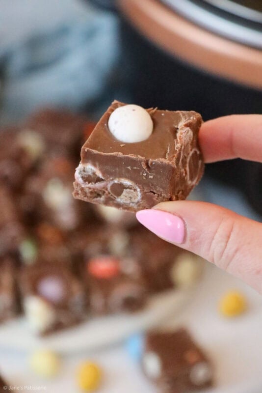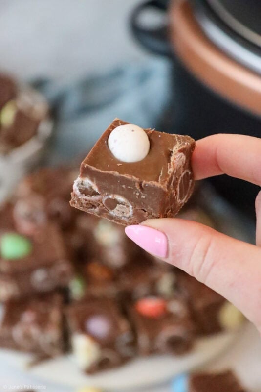 A scrumptious and simple condensed milk chocolate fudge made in the slow cooker, with an easter theme – easy slow cooker easter fudge!