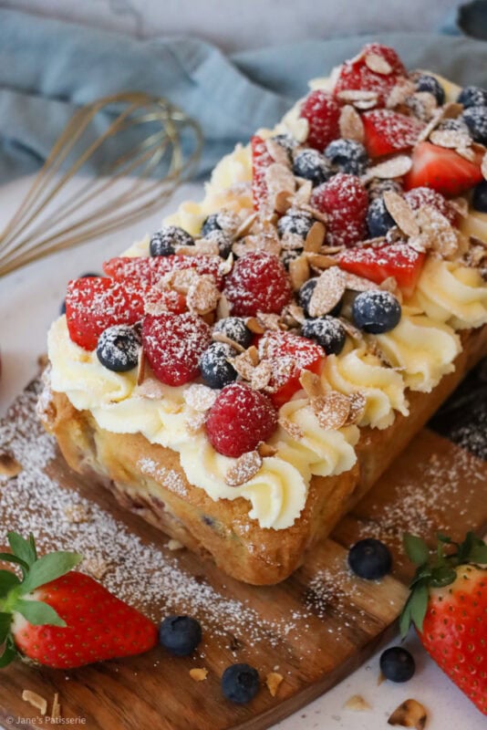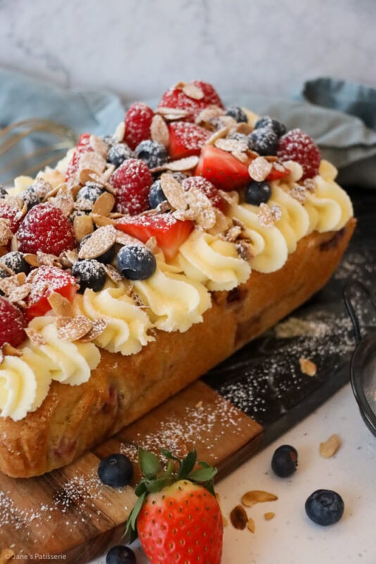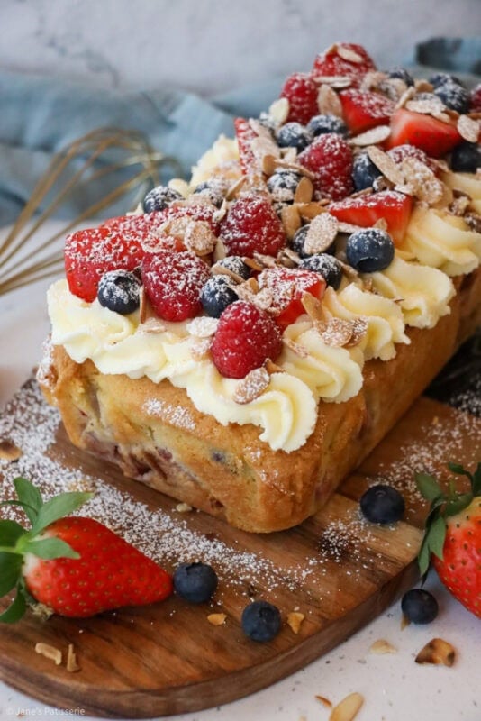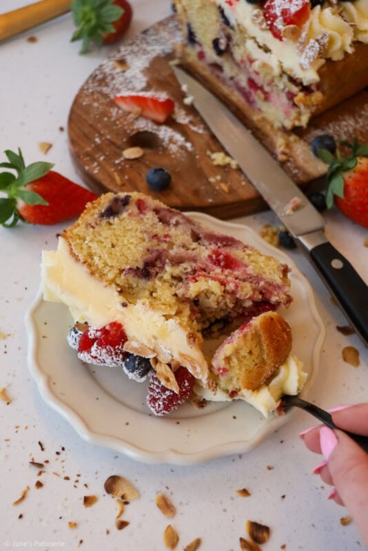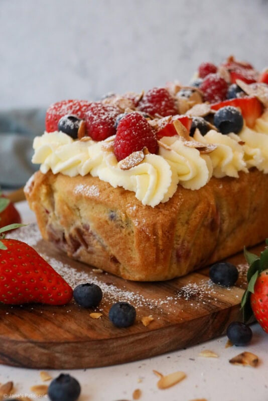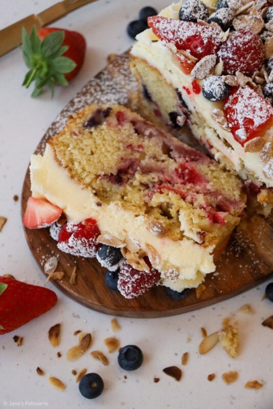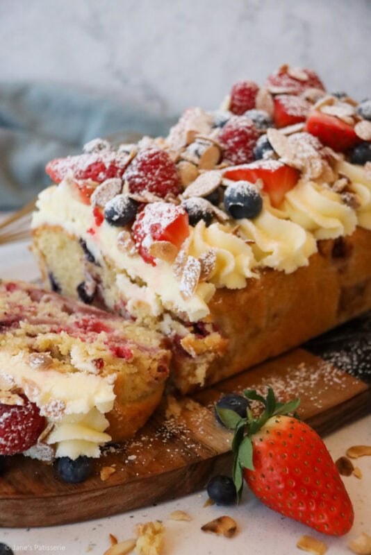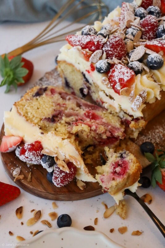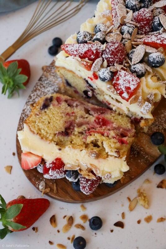 A simple fruit Bakewell loaf cake with an almond sponge stuffed with berries, and an almond buttercream frosting topping