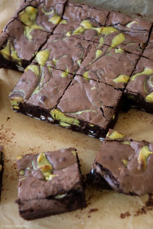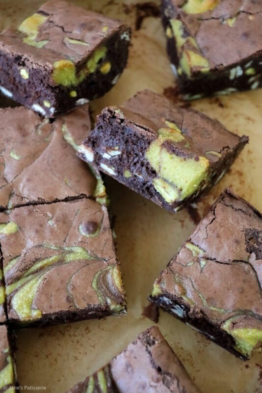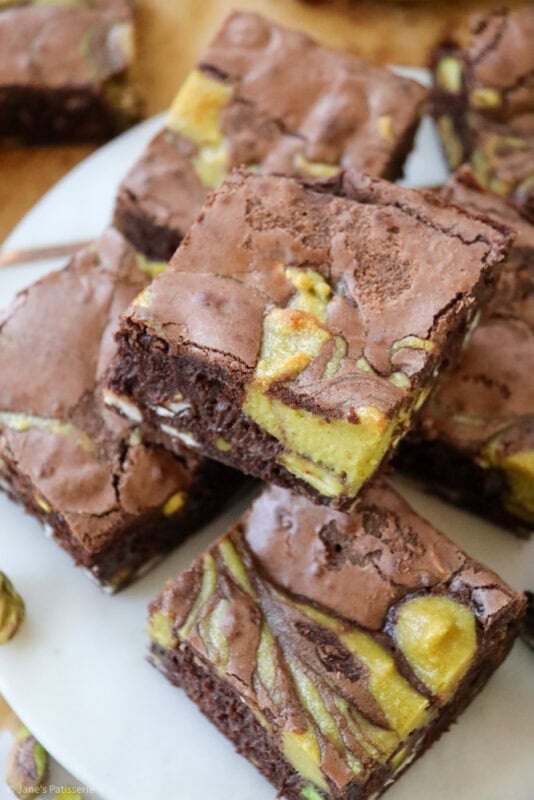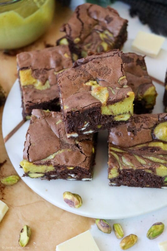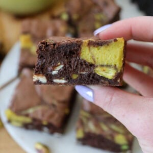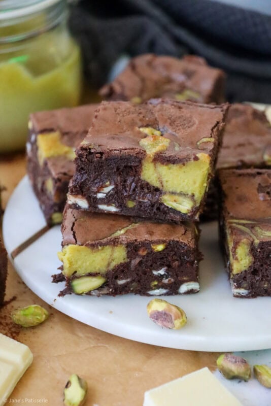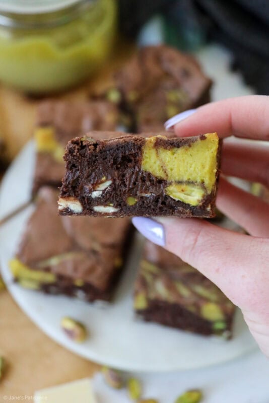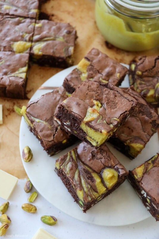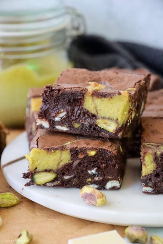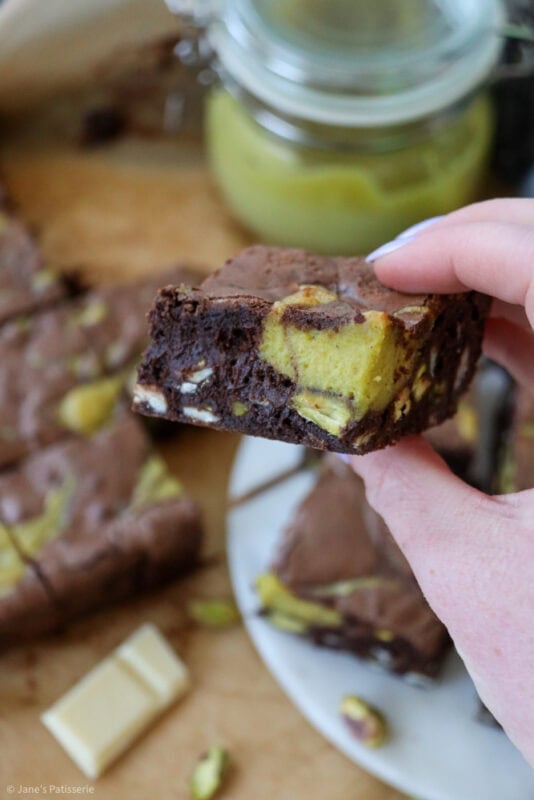 So, when it comes to this particular pistachio brownies recipe, it’s super easy. It’s a mix of the classic brownie base, white chocolate chips and chopped pistachios, and then a swirl of my homemade pistachio spread, of course.