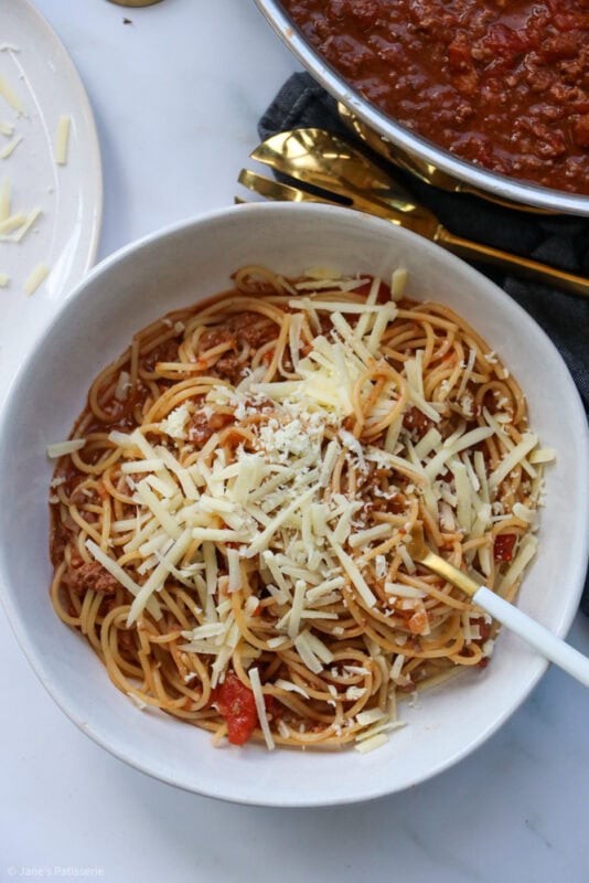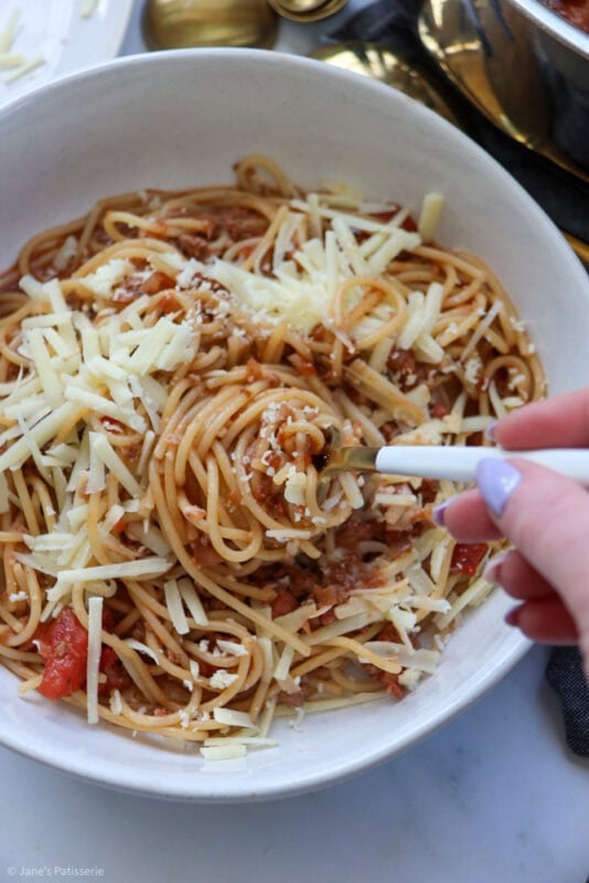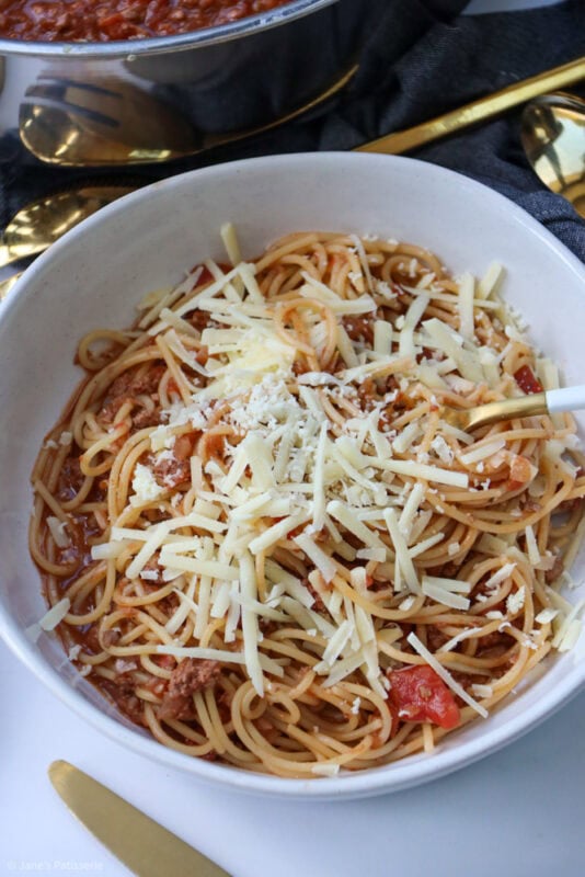 There are LOTS of opinions on how you should serve bolognese even just amongst the people that I know. I am not judging anyones methods, I am simply going to say how I have mine – with lots of pasta. I typically have spaghetti, as I like to stir the bolognese sauce through the freshly cooked pasta, and then add a layer of cheddar cheese and parmesan.