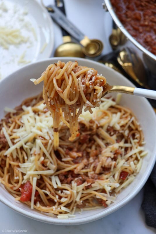 Along with my macaroni cheese, my lasagne, or even my sausage pasta bake, this bolognese recipe can show how much I adore anything related to pasta. I just love pasta, and I think it’s my favourite carb. I would say I eat a variety of food during the weeknights, but I just don’t get bored of a pasta based meal.