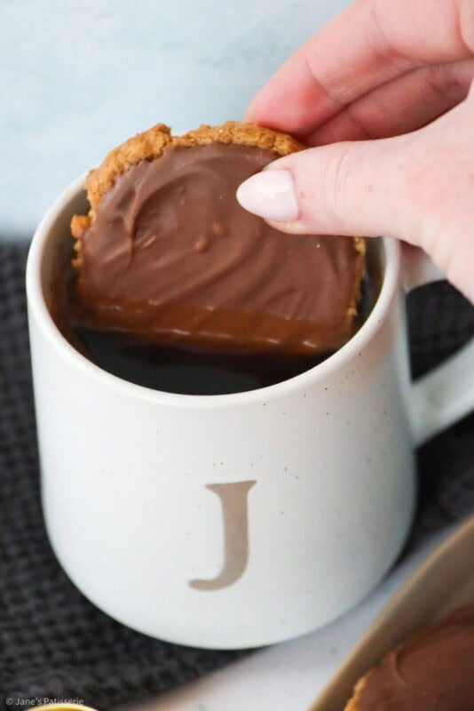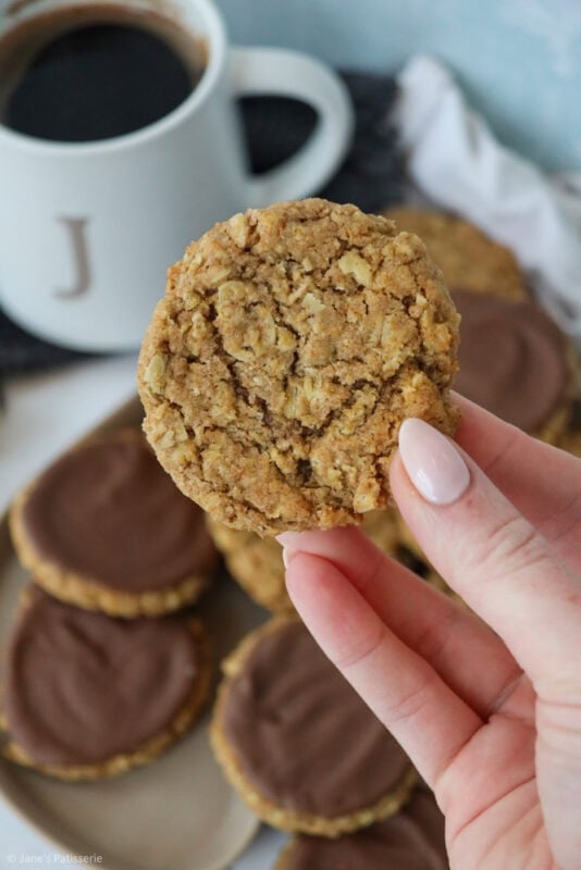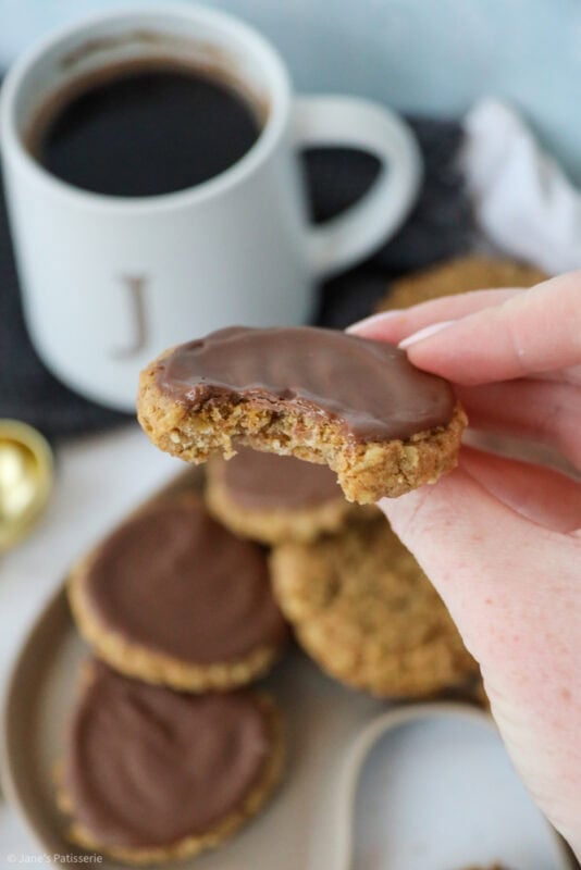 I made these cookies today and I am amazed at how easy it was from start to finish! Everything into one bowl, then formed into balls, bake and cool, and then chocolate topping. I am very happy that I got to make and try these, especially since I didn’t know what a Hobnob was until I saw Jane’s recipe! My husband isn’t the biggest fan of oats in cookies but he loved these!! I took them out of the oven around the 13 min mark and they turned out chewy and delicious. Definitely a recipe I want to make again 🙂