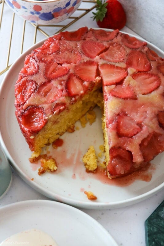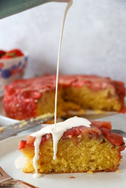The strawberries in this bake can bubble up slightly to create almost a jam like consistency around the edge of the cake, but that’s expected, and delicious. Once the cake has been baked, you want to take it out of the oven, and leave it to sit in the tin for about ten minutes.